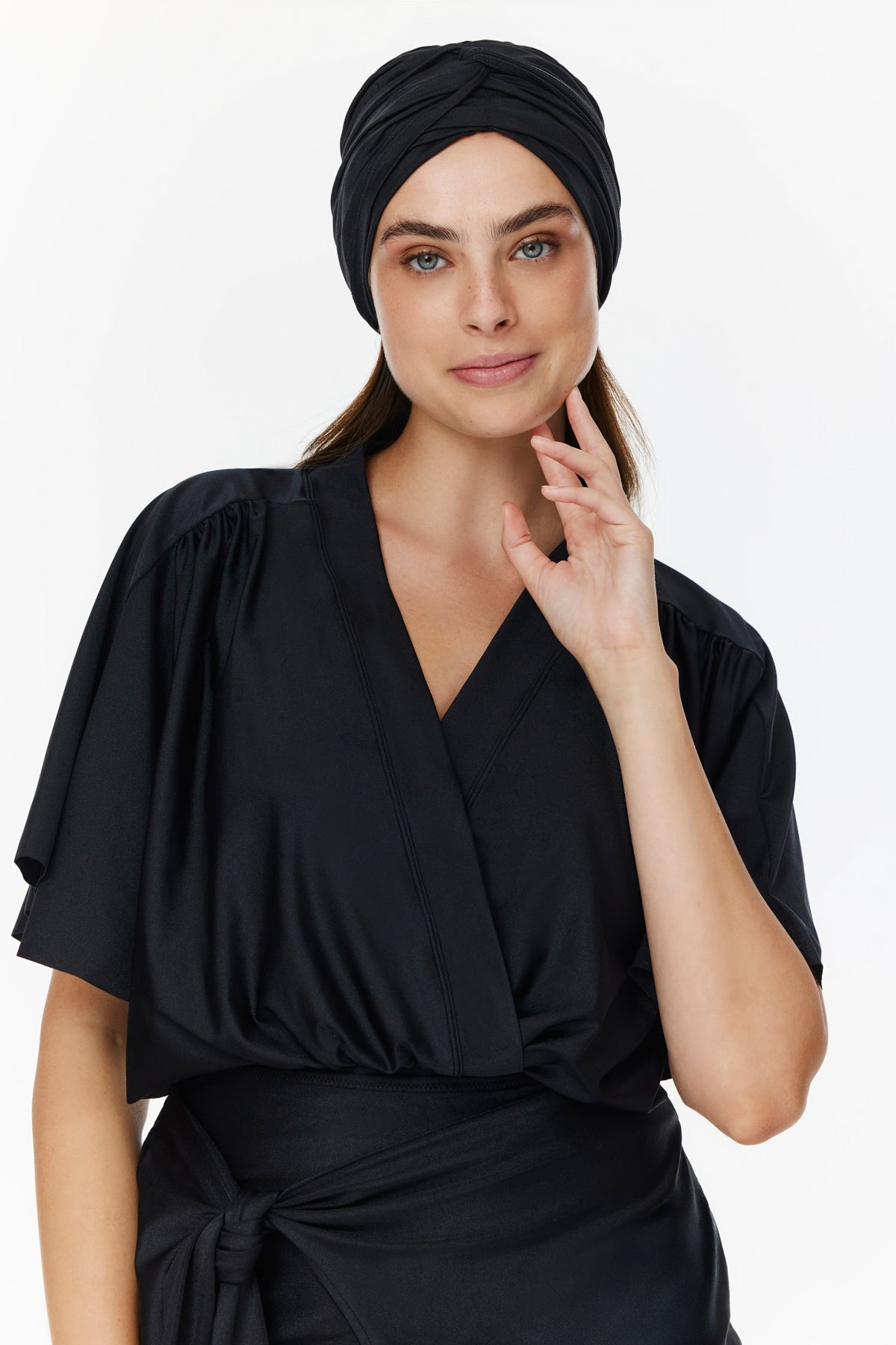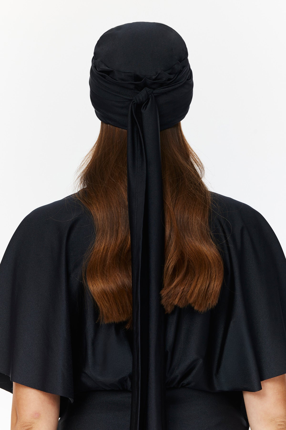 כיסוי ראש עם רצועות קשירה שחור מבריק