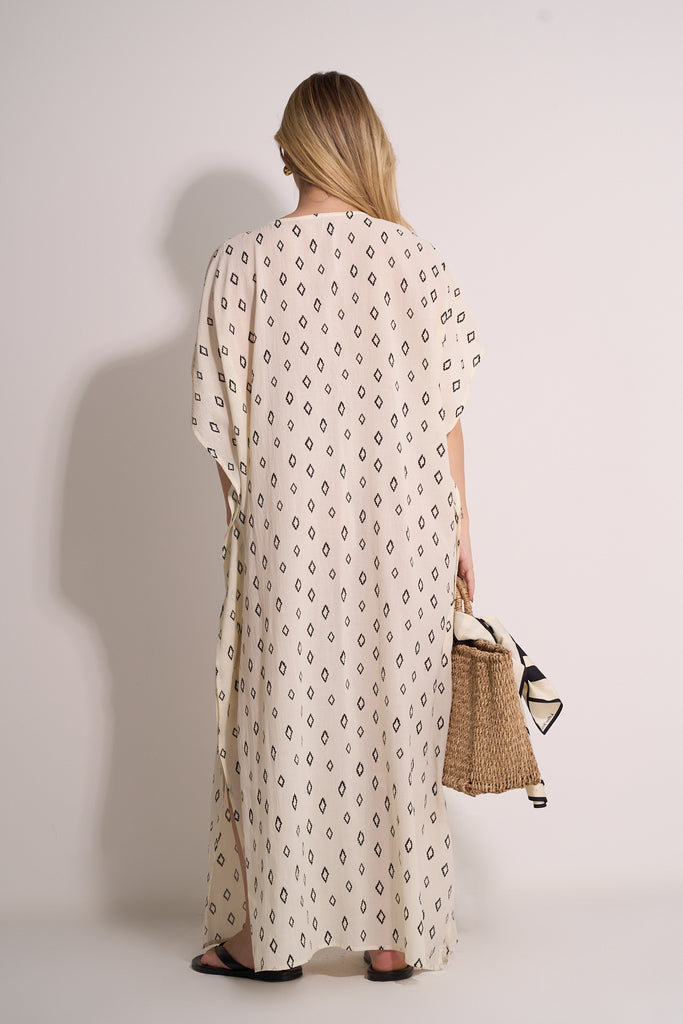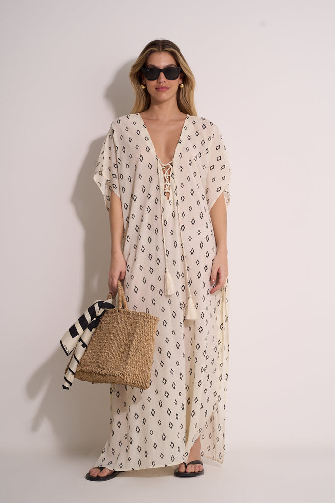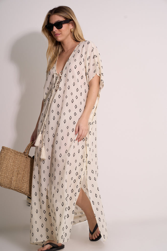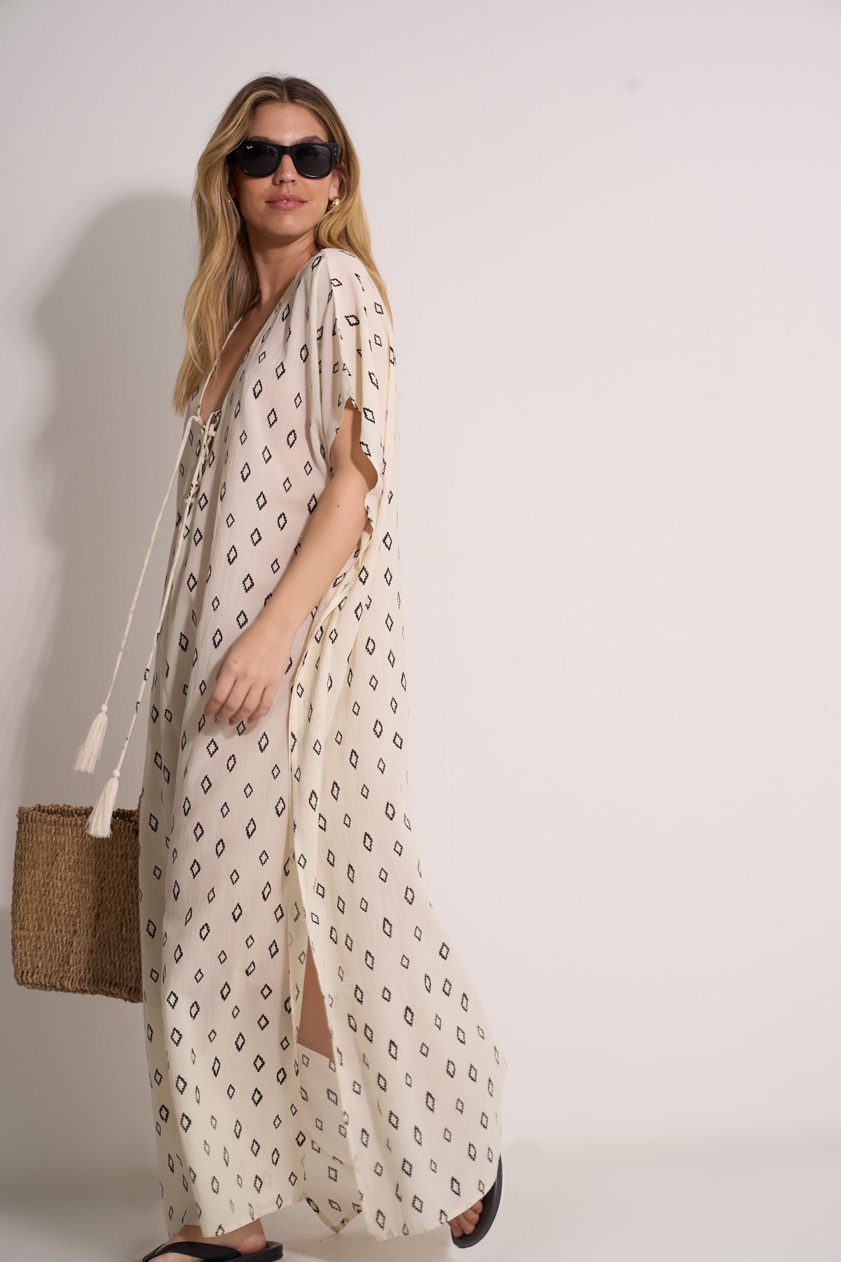 שמלת גלביה באורך מקסי, מחשוף וי עם קשירה בחזה ושסעים בצדדים.