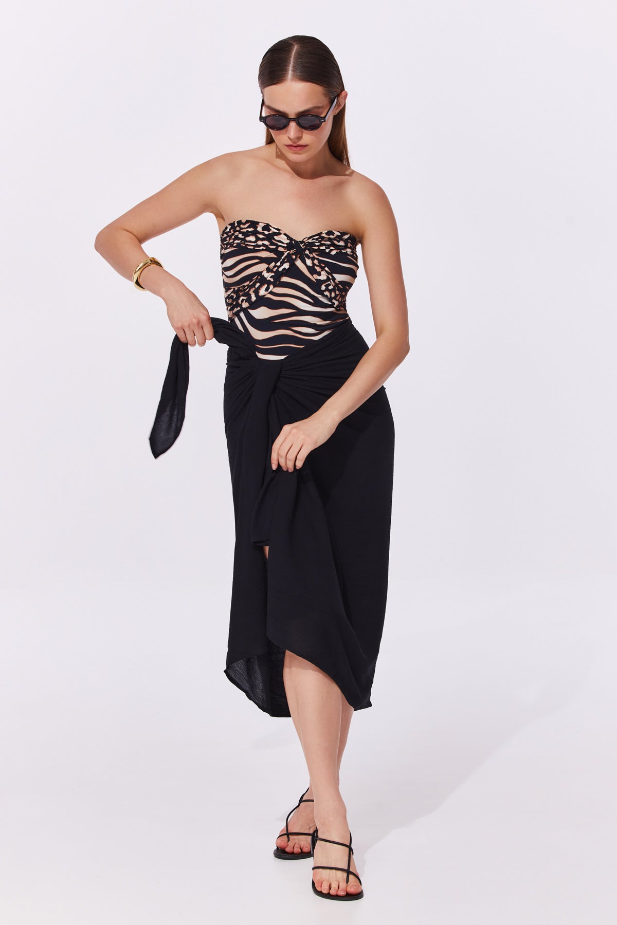 בגד ים שלם בגזרת סטרפלס בשילוב שני הדפסים ליצירת עניין ומשחק