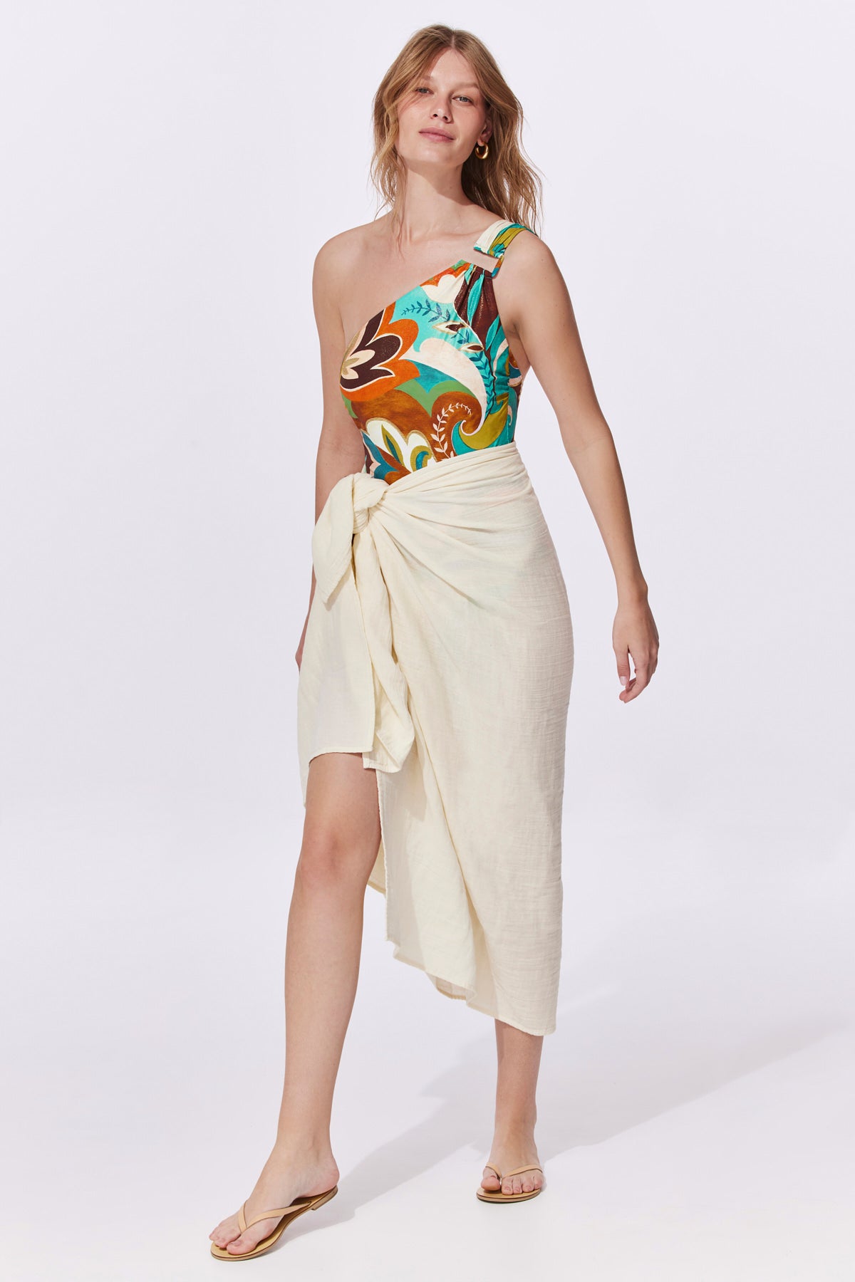 בגד ים שלם בהדפס צבעוני חום עם כתף אחת ואביזר ברזל