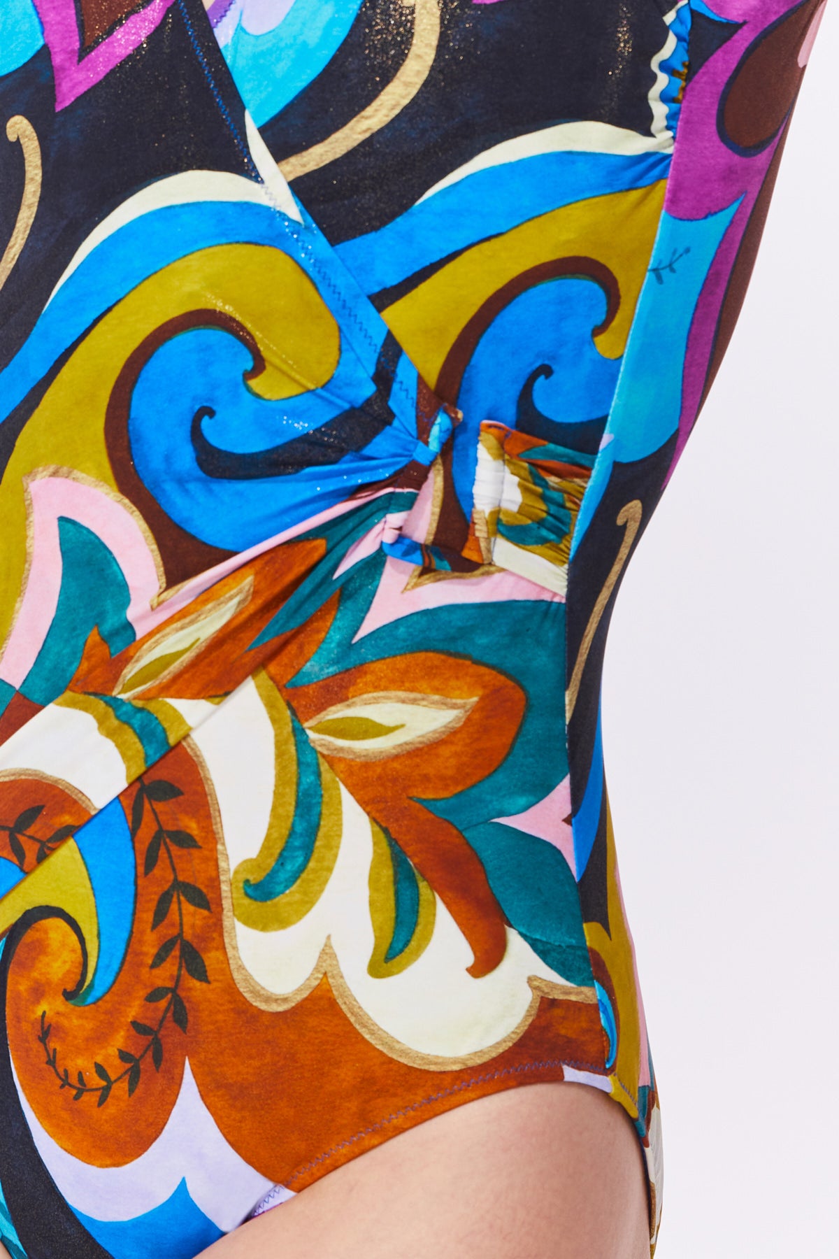 בגד ים שלם בהדפס צבעוני, מעטפת עם אביזר מתכת למראה אופנתי וטרנדי.