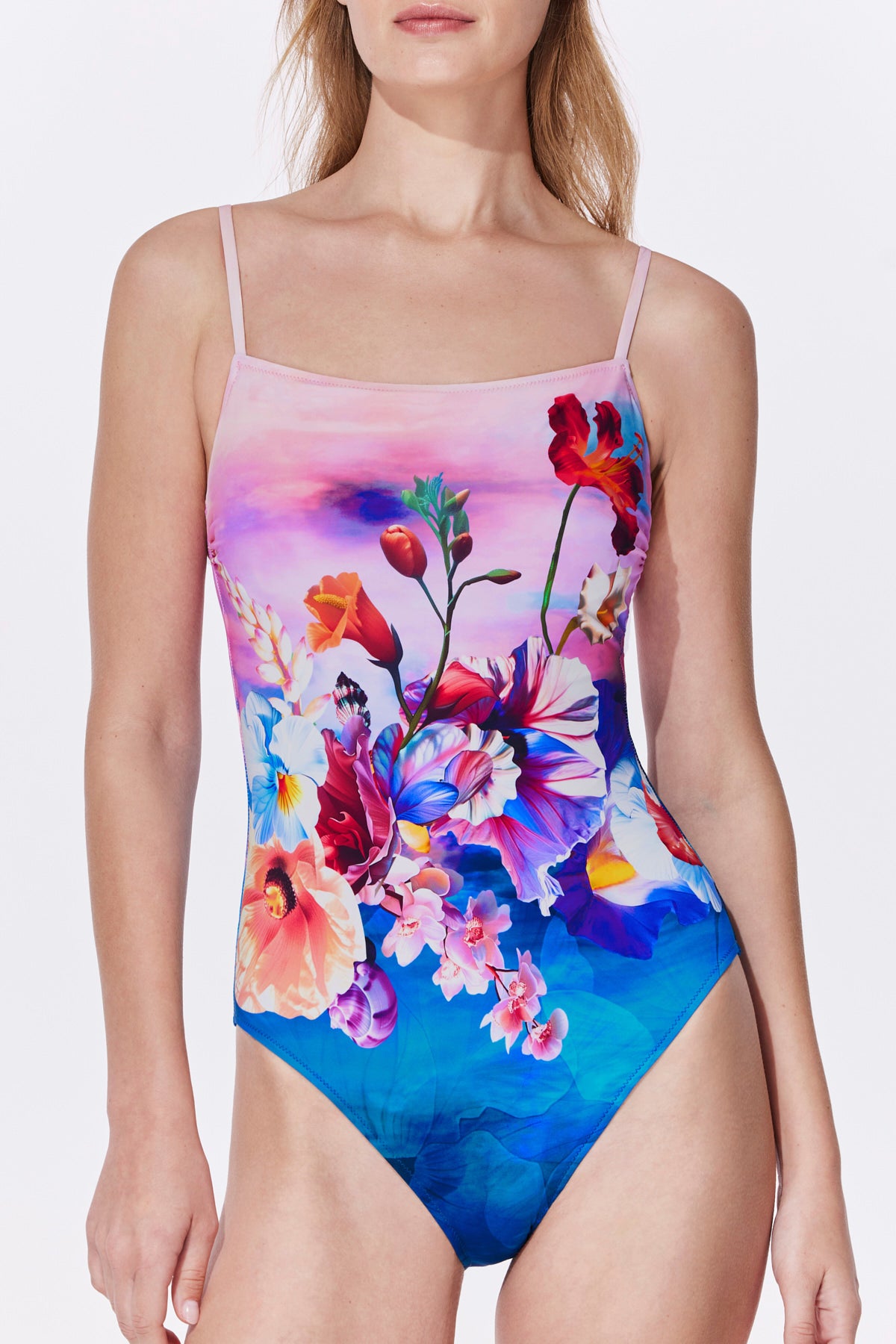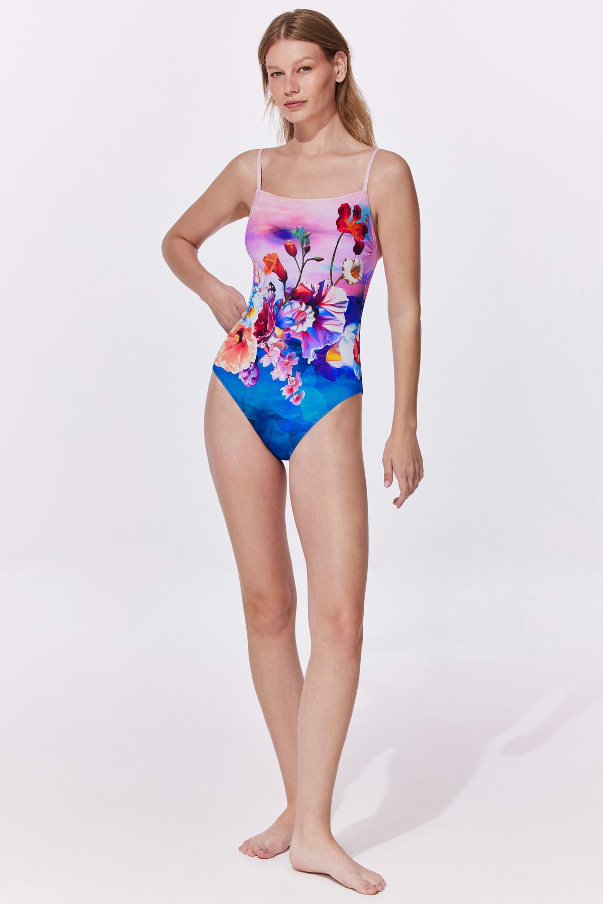 בגד ים שלם פרינט ממוקום של פרחים וים.