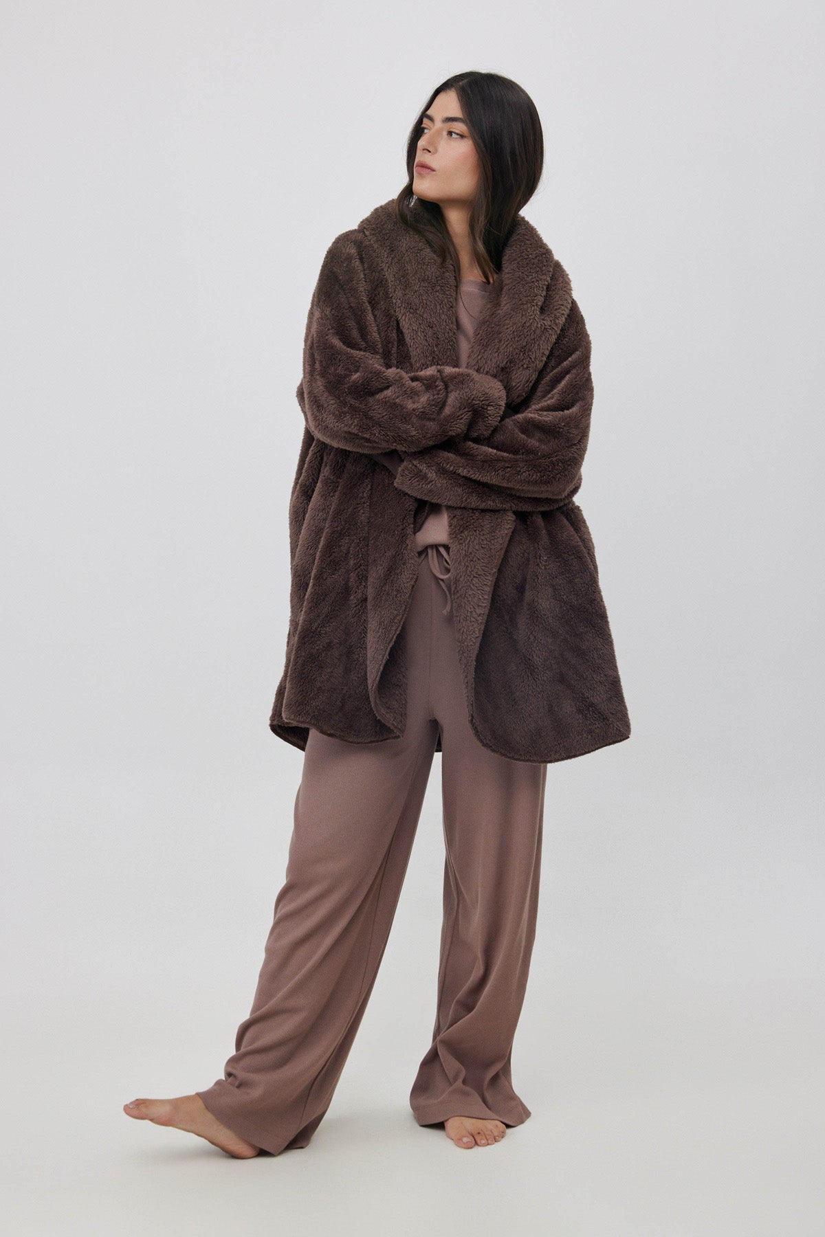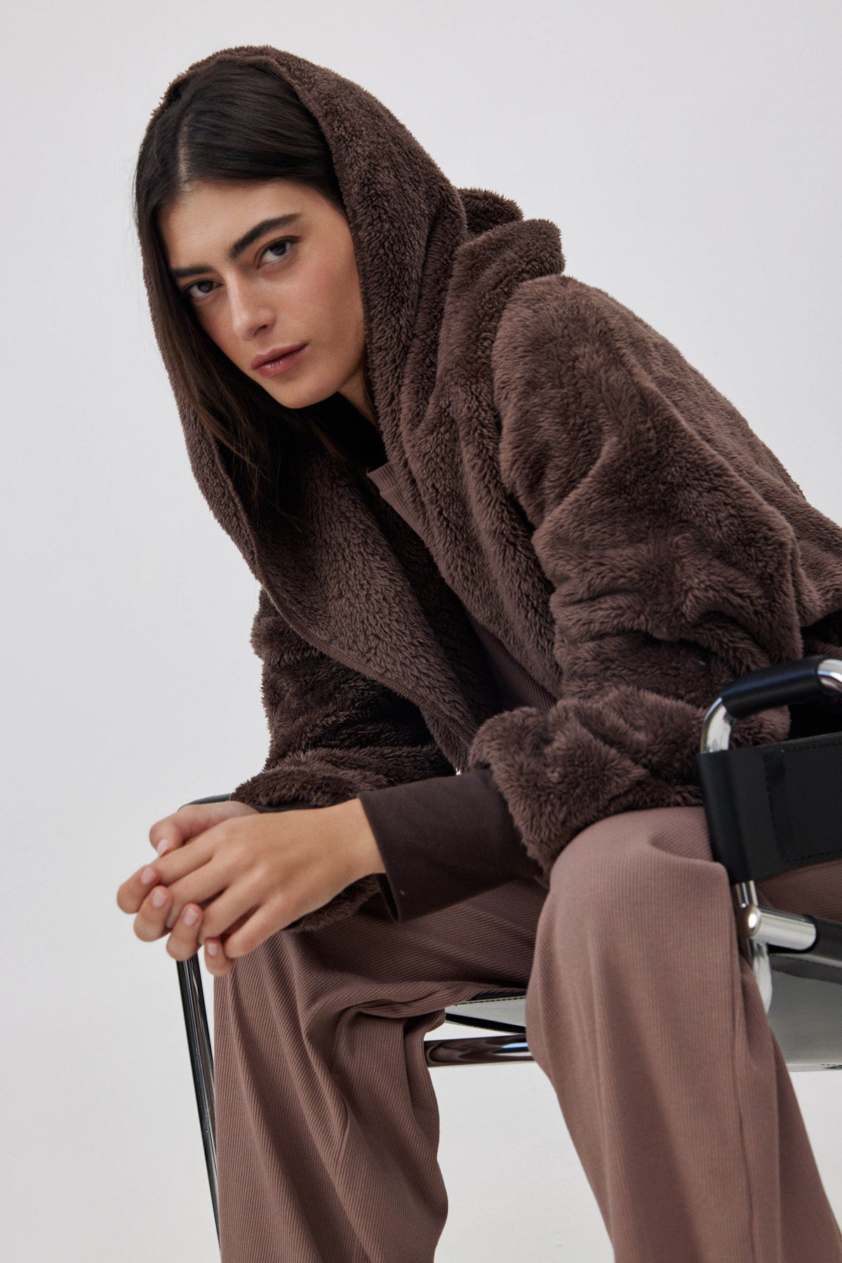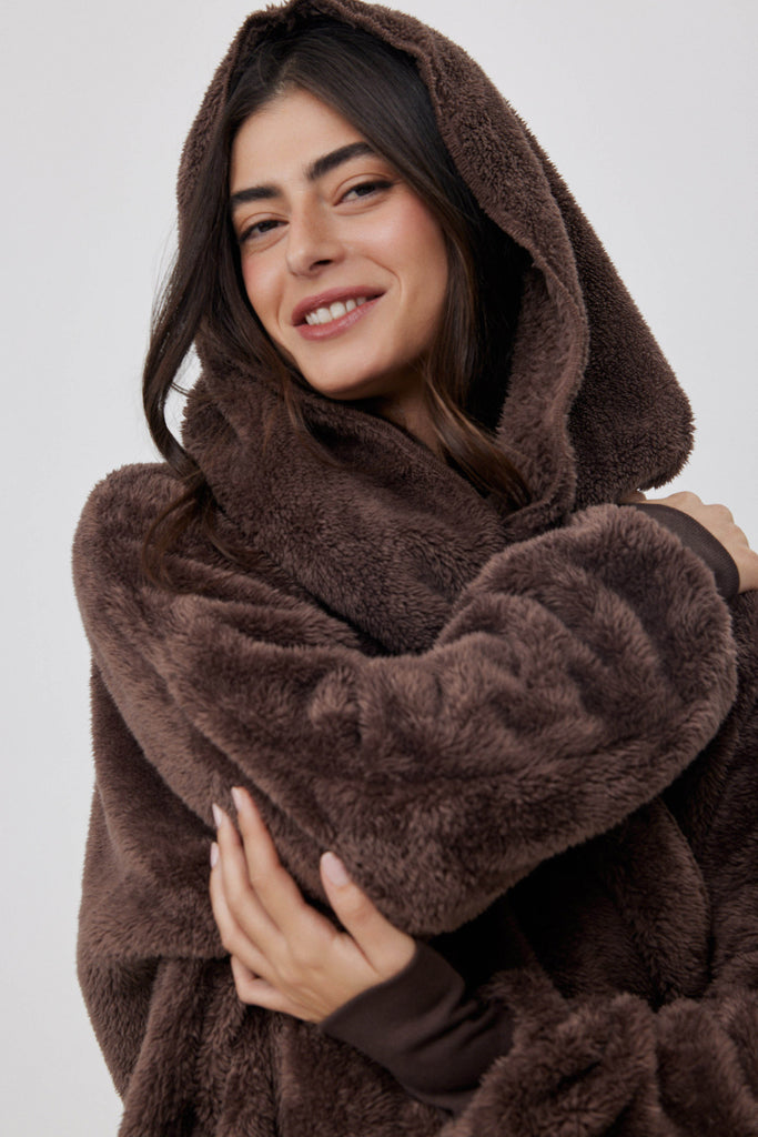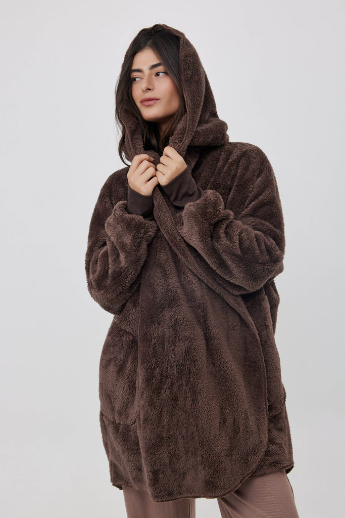 ג'קט פלאפי מפנק מבד נעים ומחמם במיוחד, עם כובע וכיסים בצדדים.