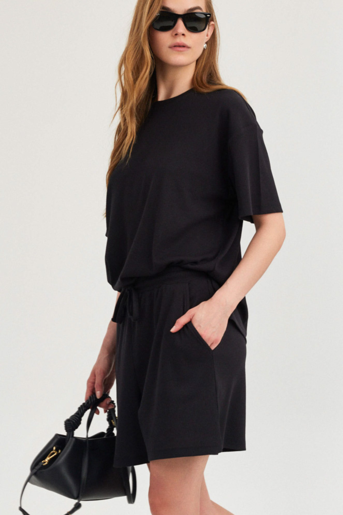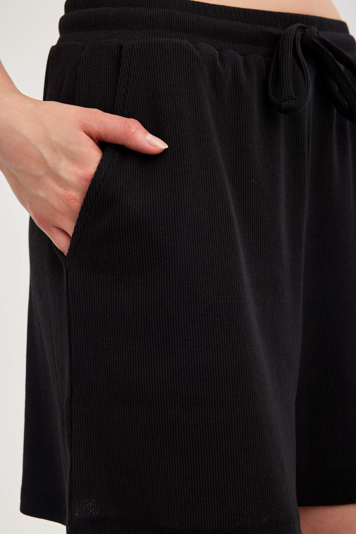מכנסיים קצרים בצבע שחור מבד ריב. קשירה בחזית.