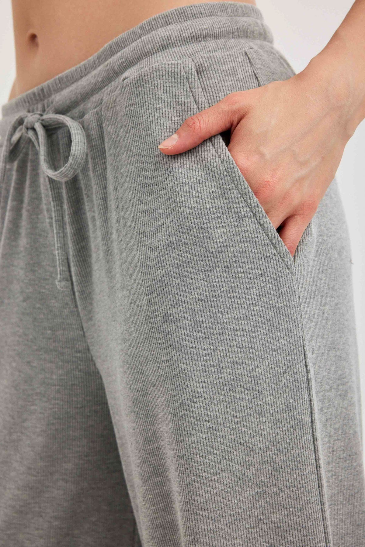 מכנסיים ארוכים רחבים בצבע אפור מבד ריב. קשירה בחזית.