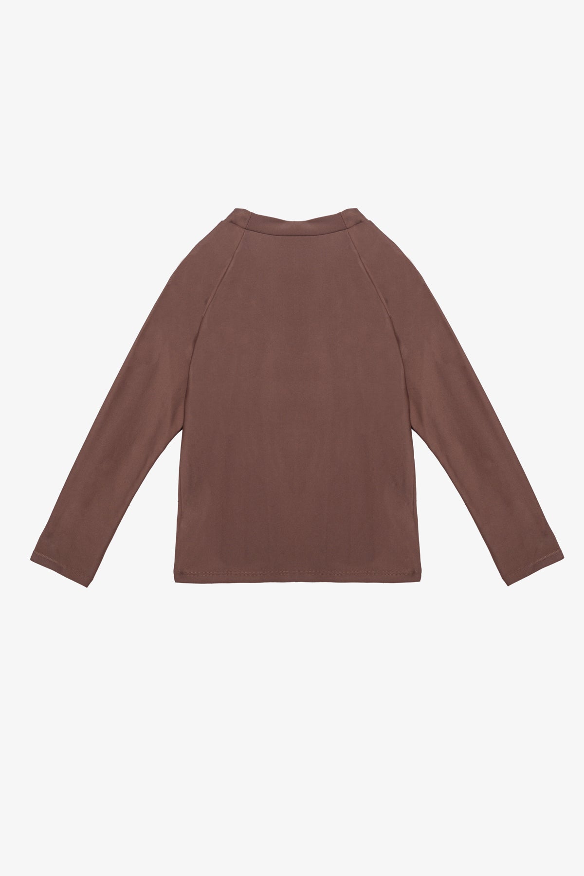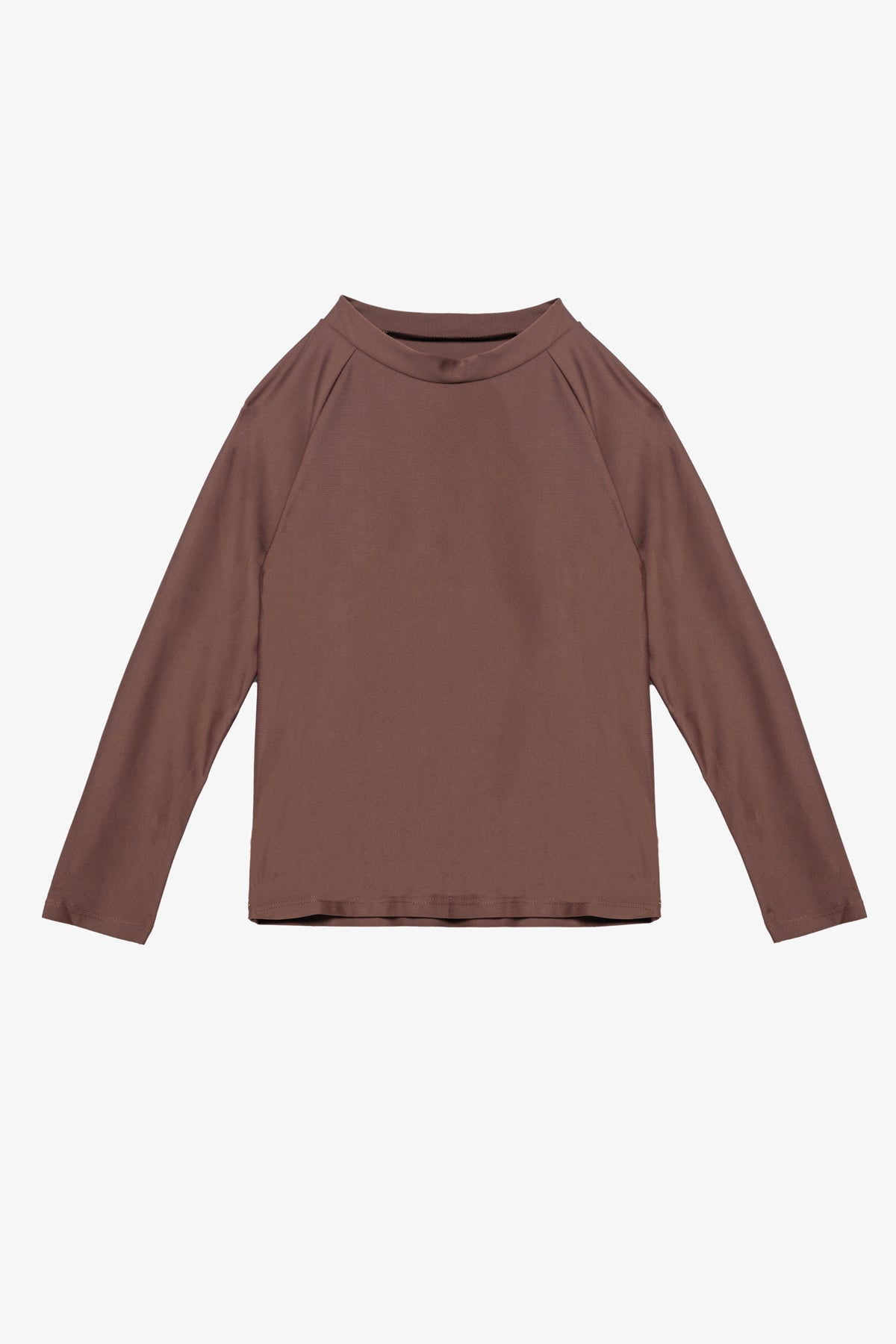חולצת לייקרה בגד ים בצבע חום מוקה עם שרוולים ארוכים ומפתח צוואר עגול