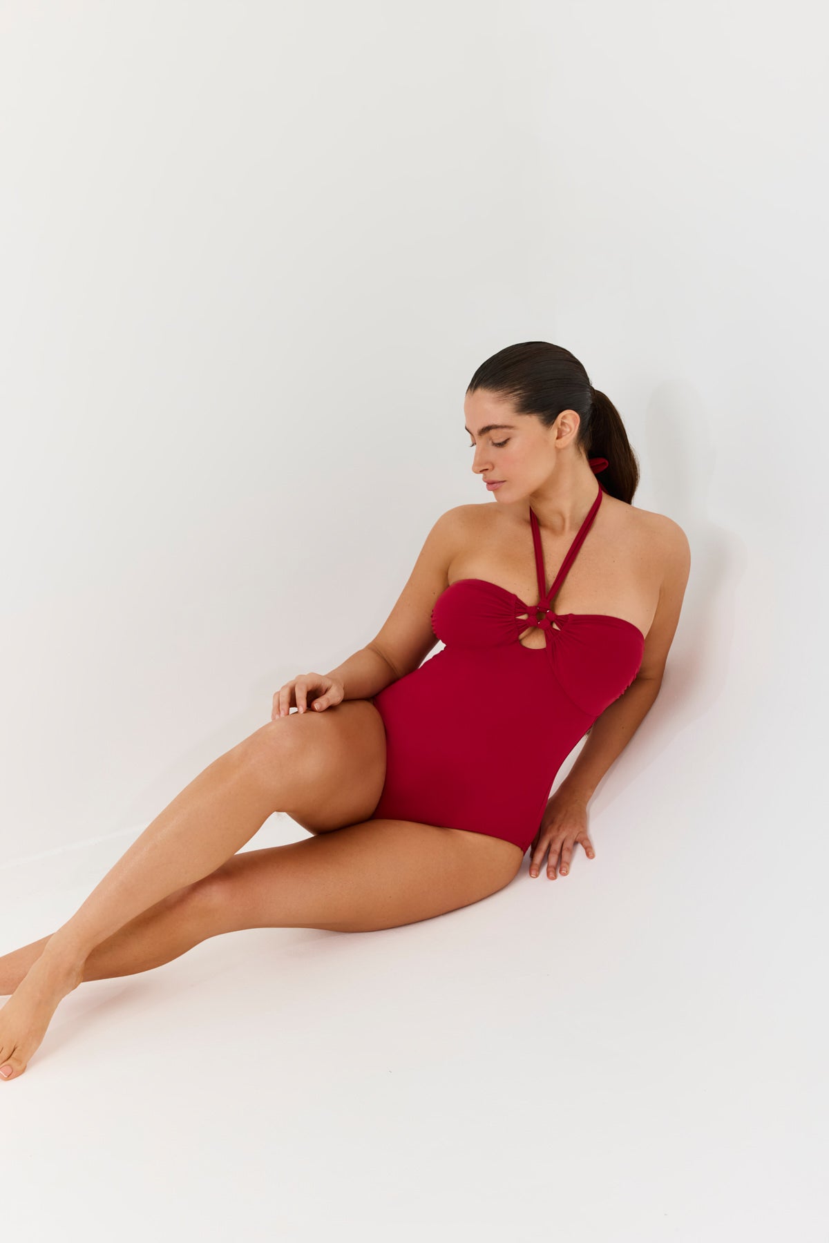בגד ים שלם בסיומת קשירה ועצמות בצד החזיה לשמירה על מבנה מוקפד של הקאפ.