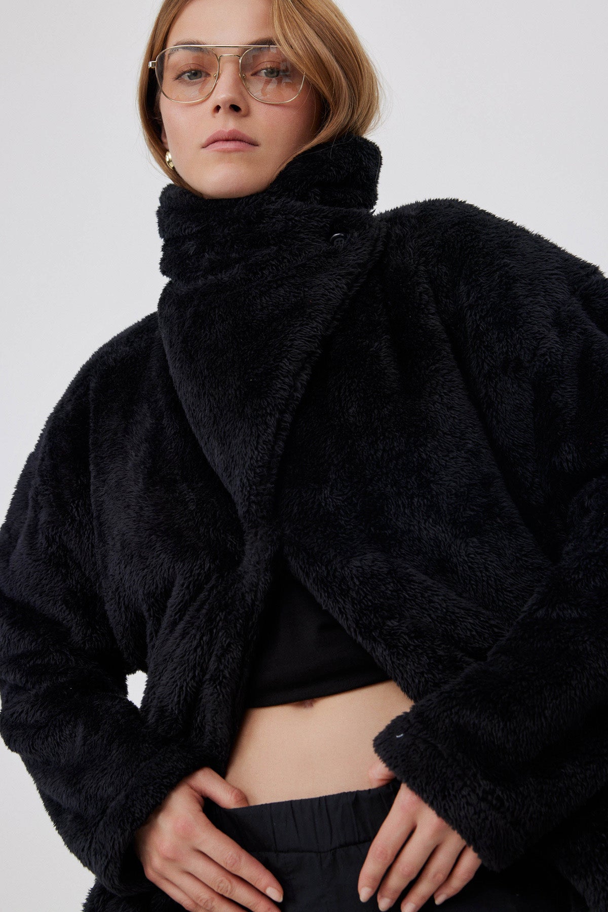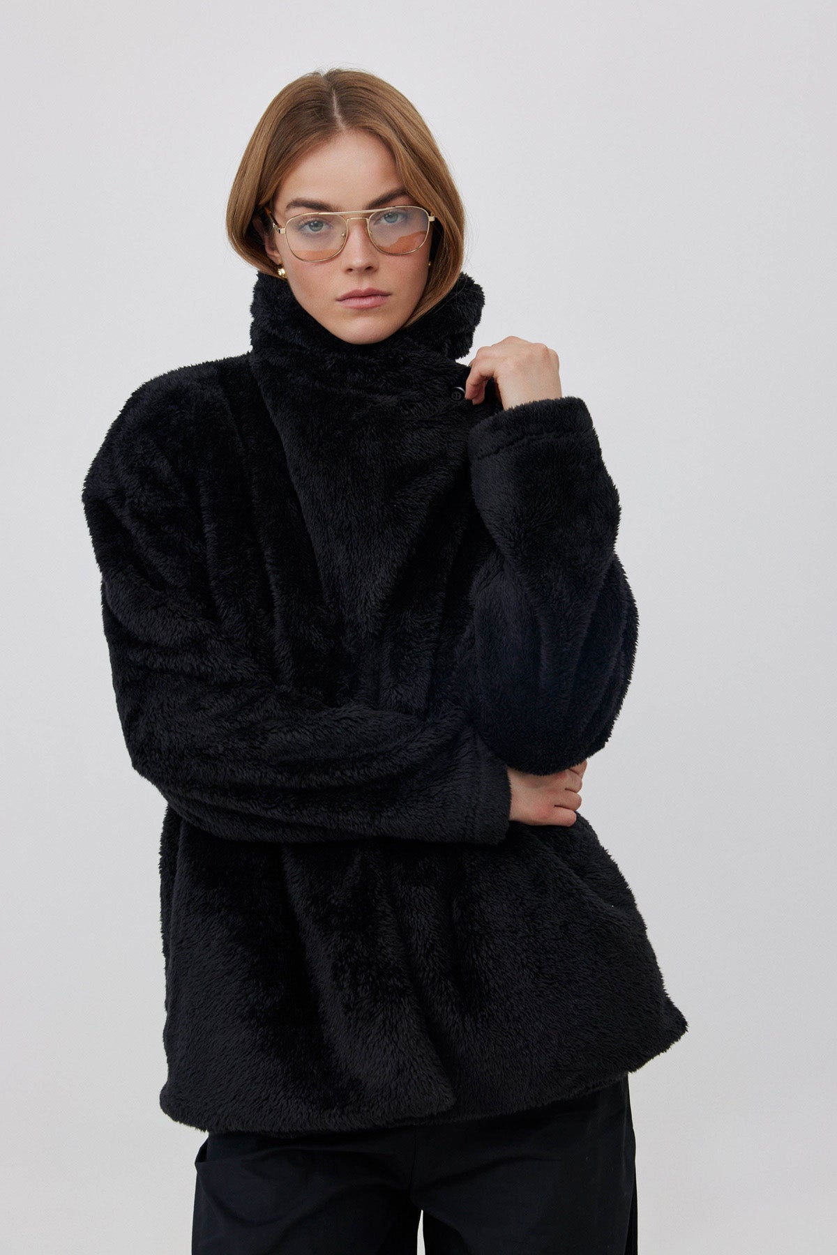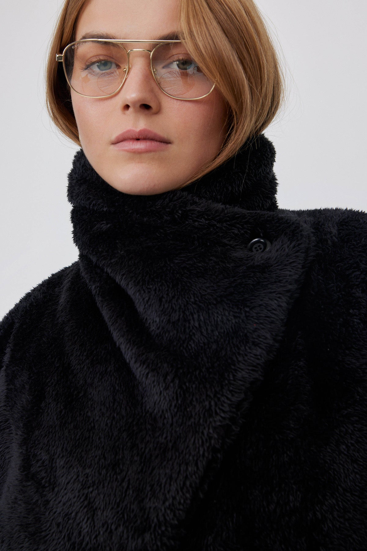 ג'קט פליז בעל צווארון רחב , ניתן ללבוש גם כמעטפת סביב הצוואר עם סגירת כפתור