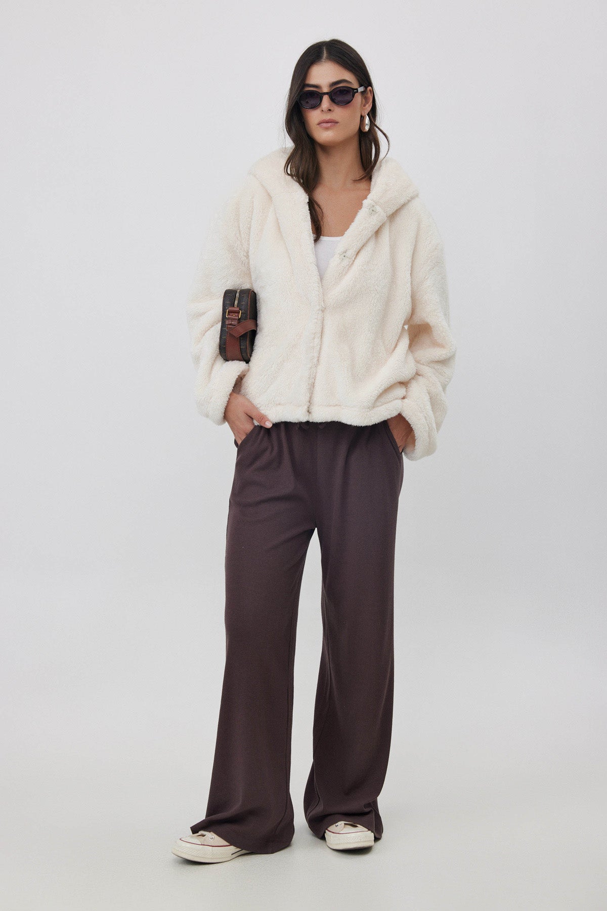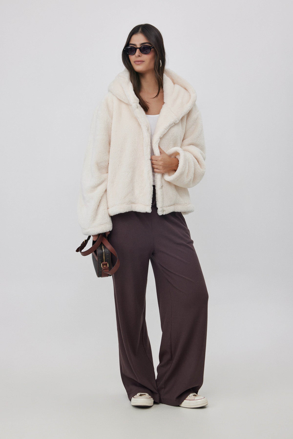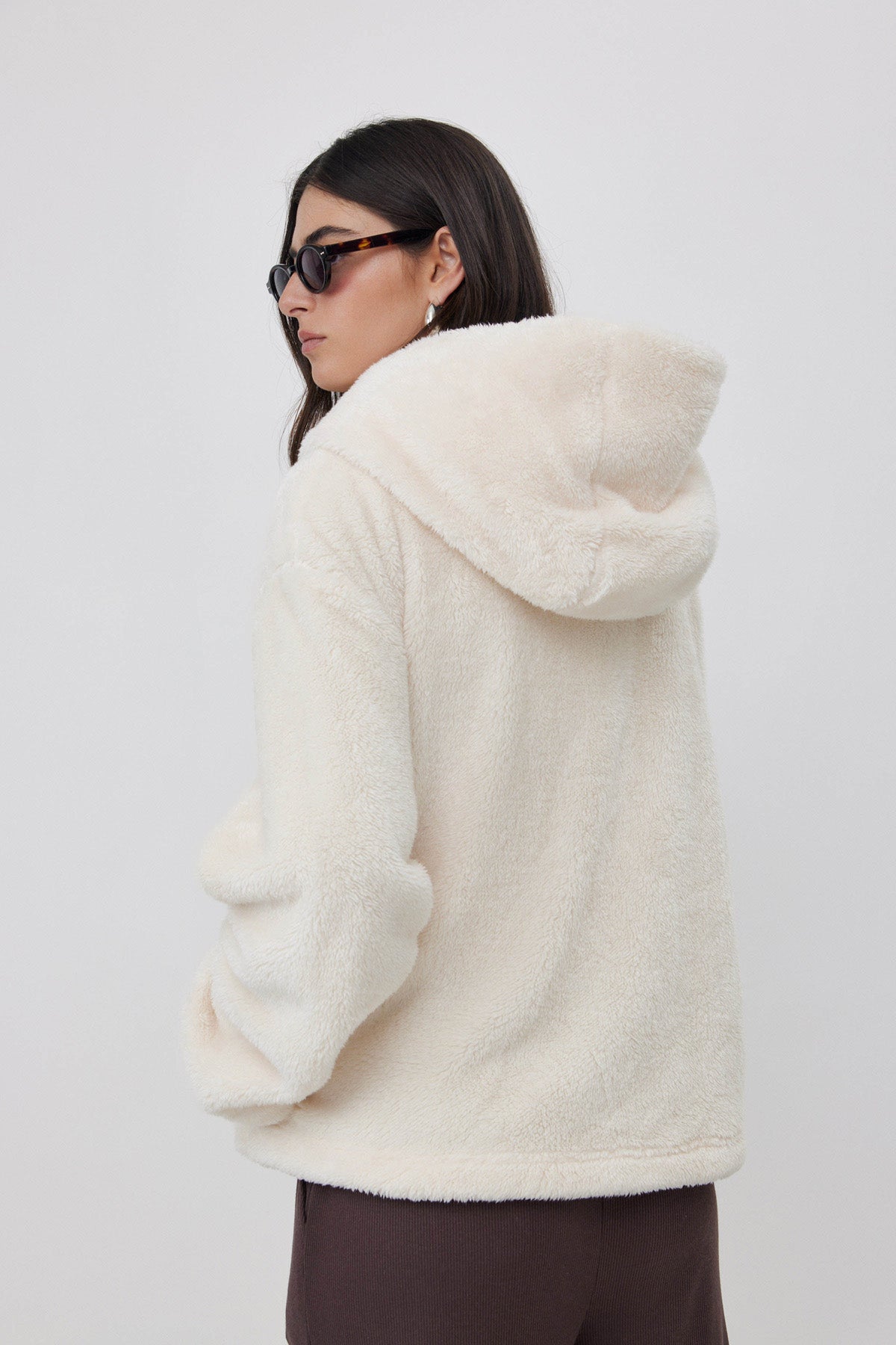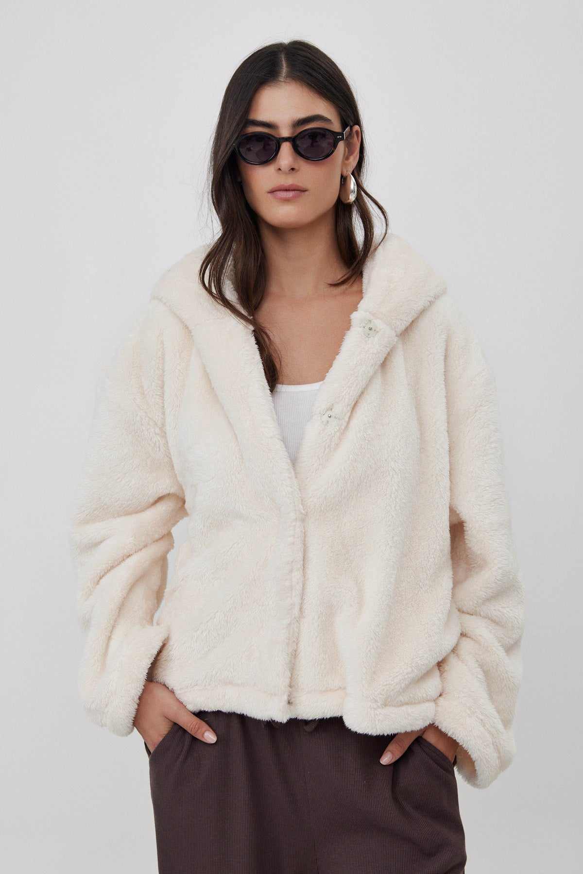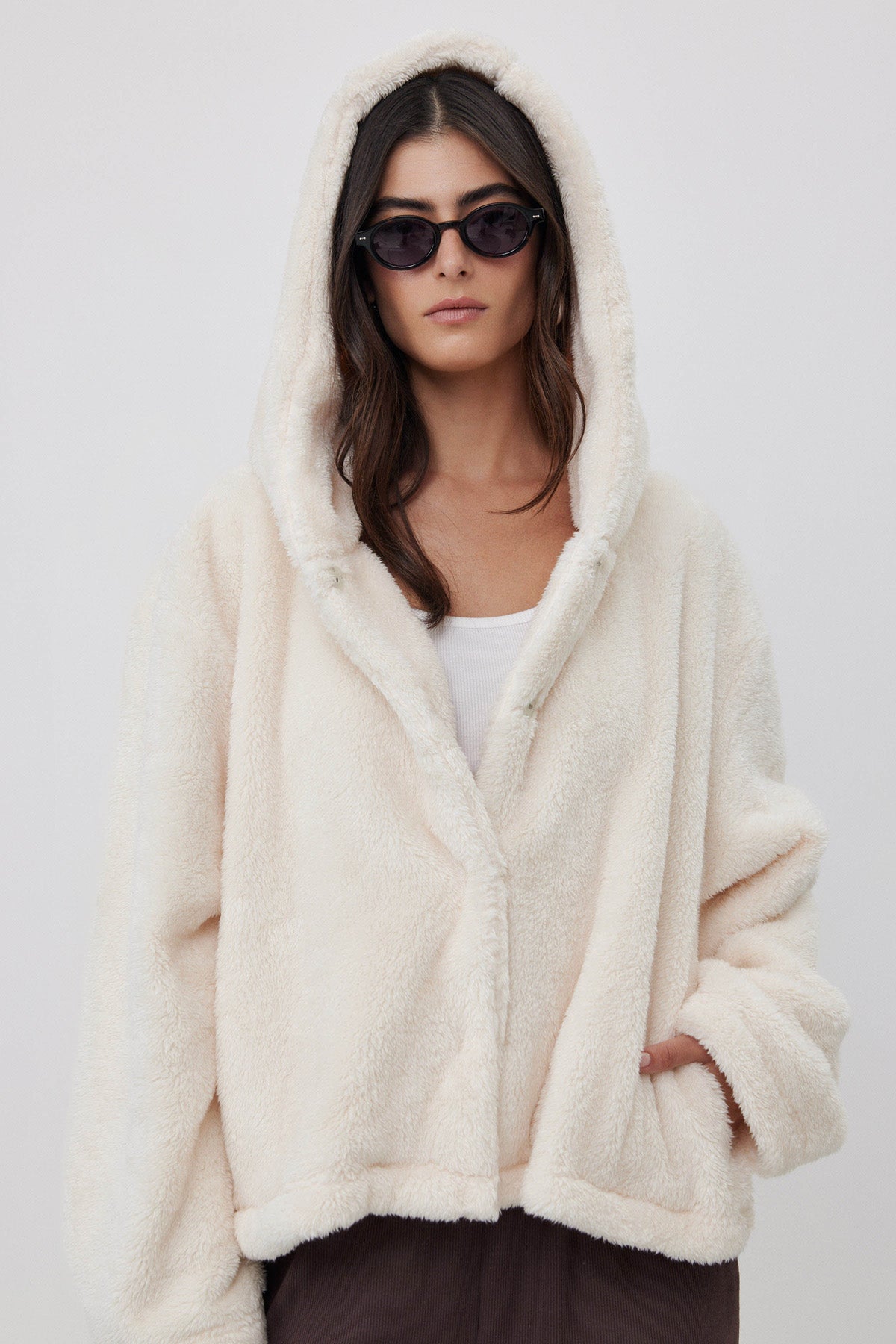 ג'קט פליז קצר עם כובע שמנת