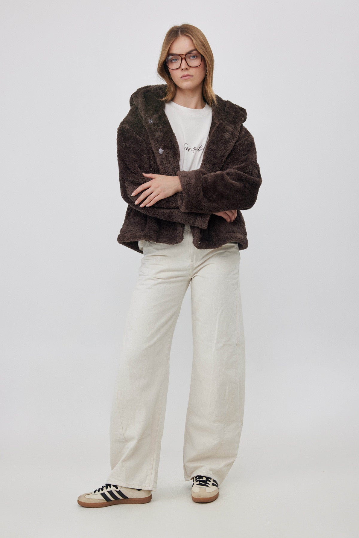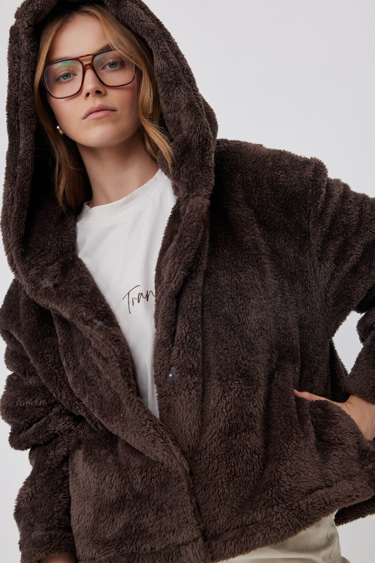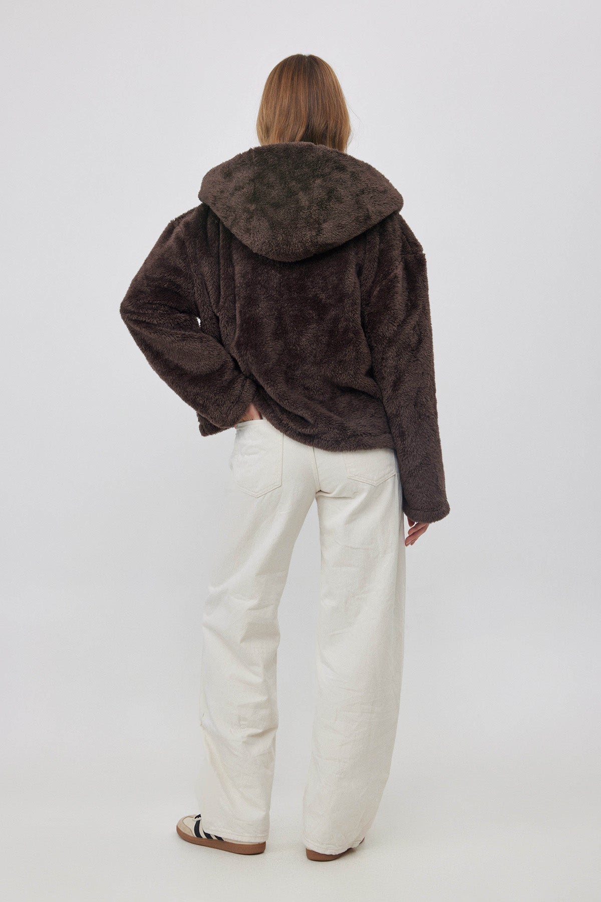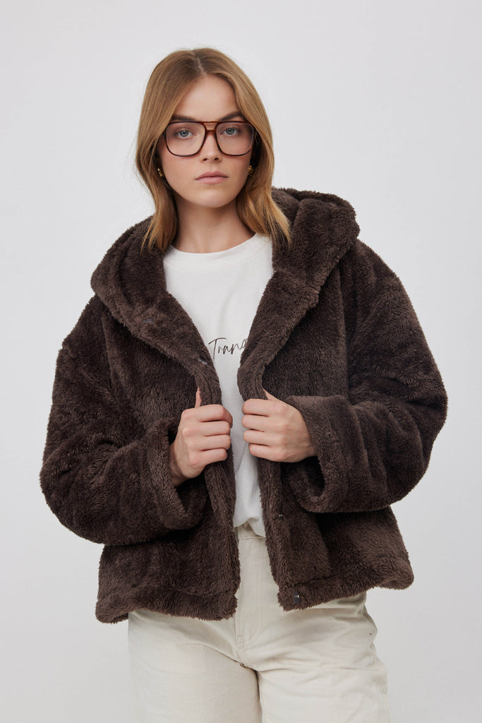 ג'קט פליז קצר עם כובע חום