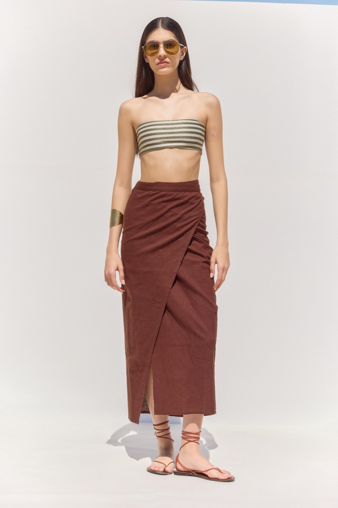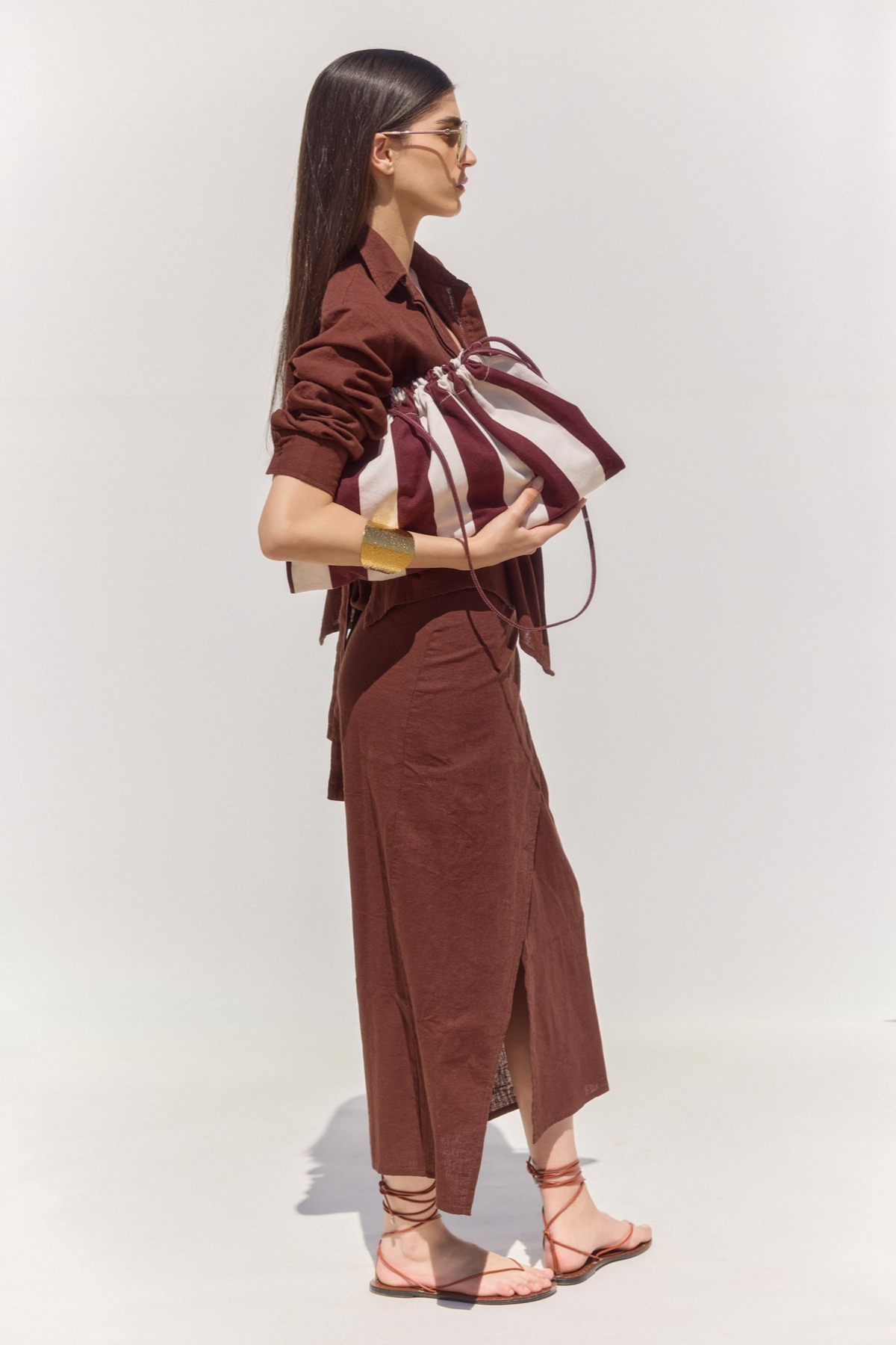 חצאית מידי בגזרת מעטפת מבד תעשרובת פשתן עם רצועות לקשירה במותן