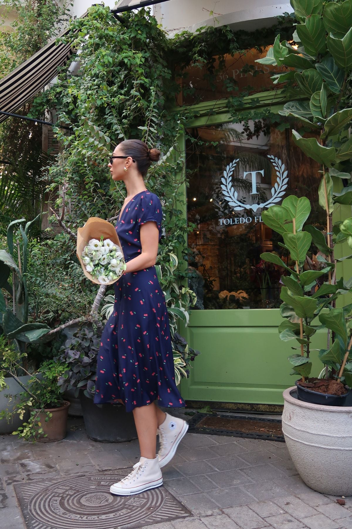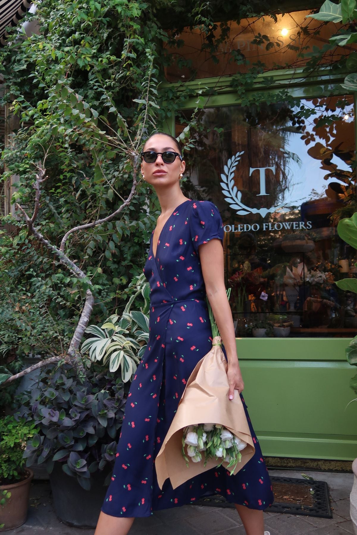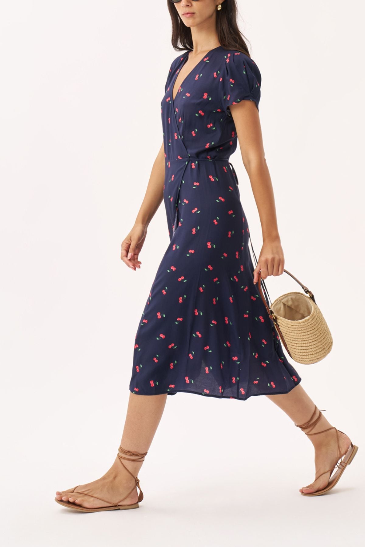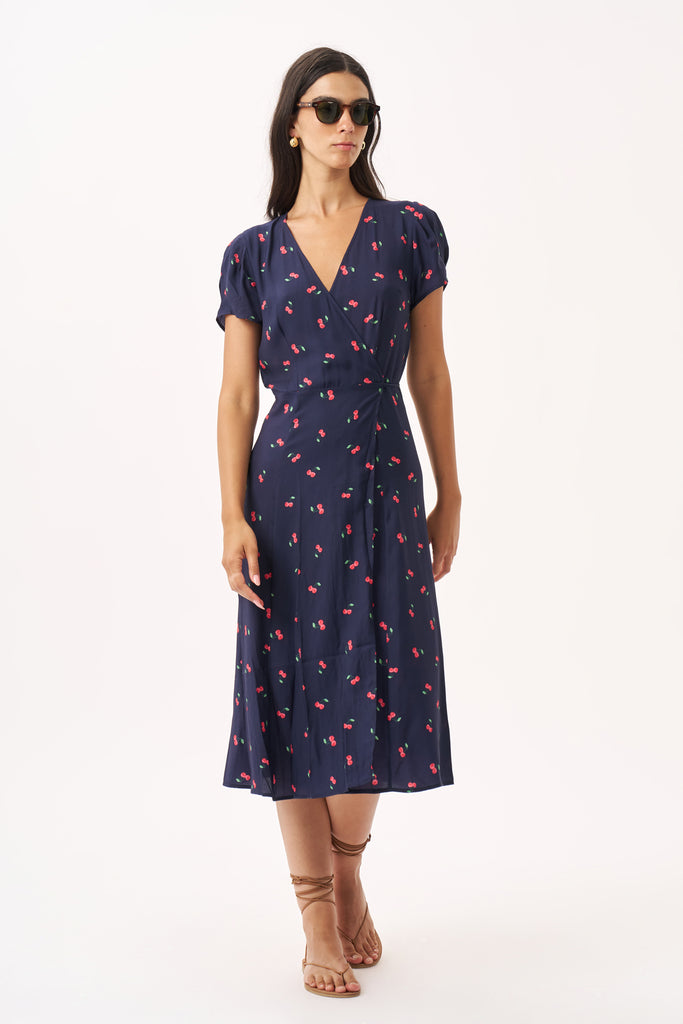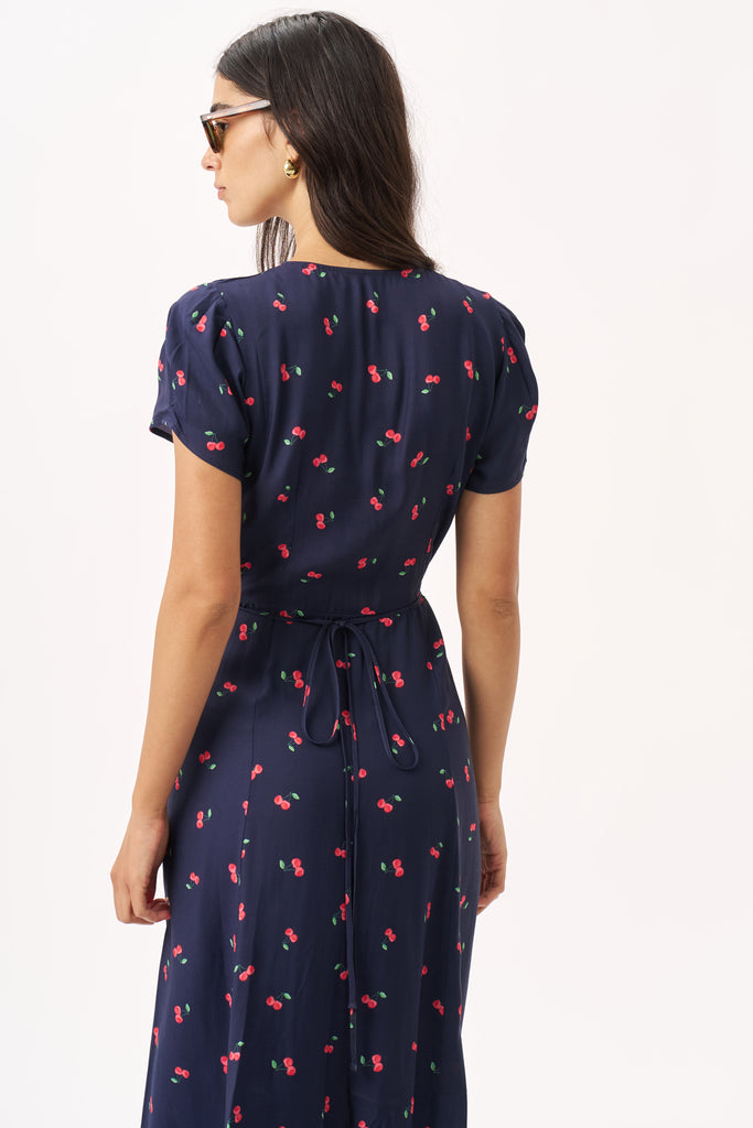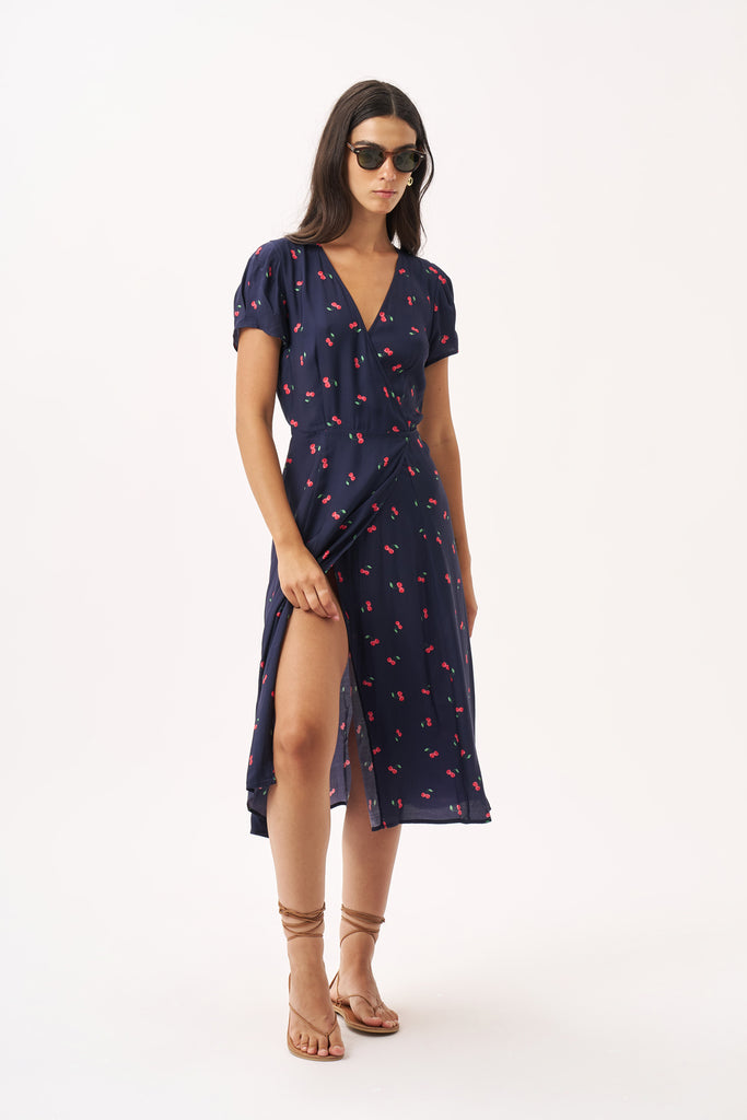 שמלה באורך מידי בגזרת מעטפת הדפס דובדבנים נייבי