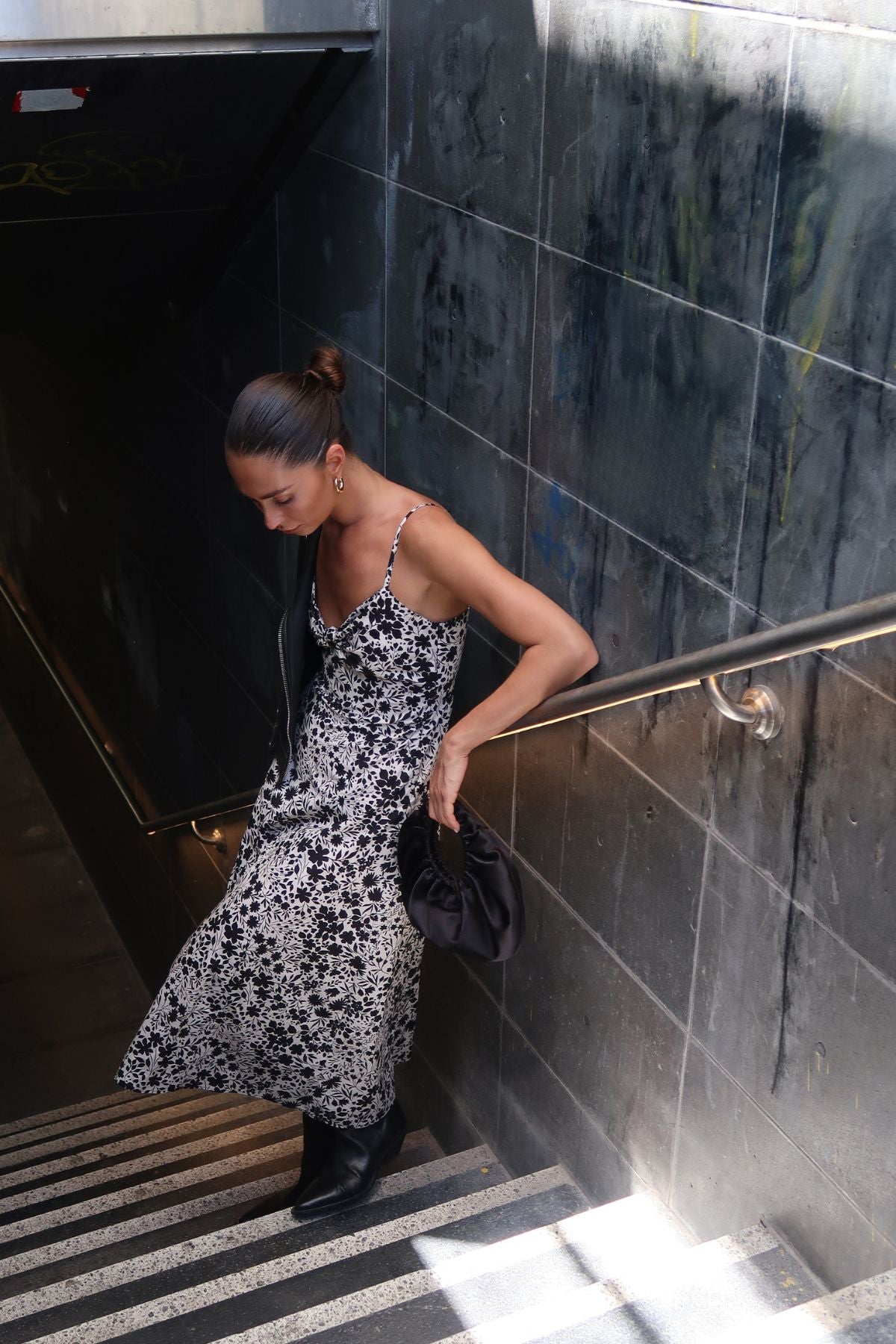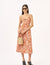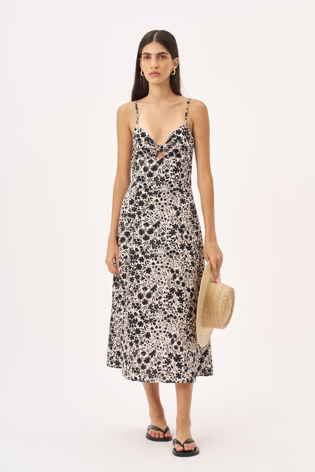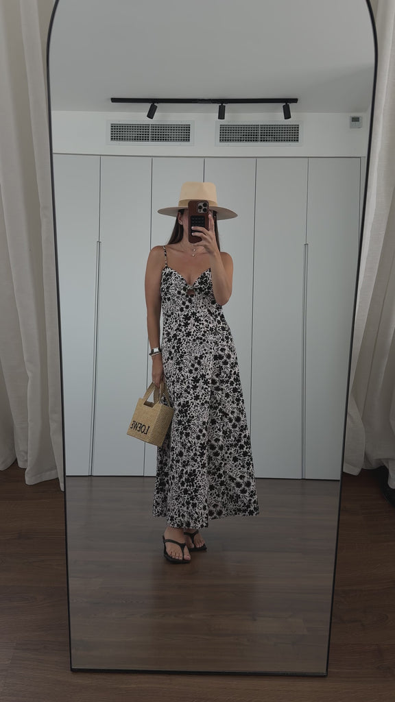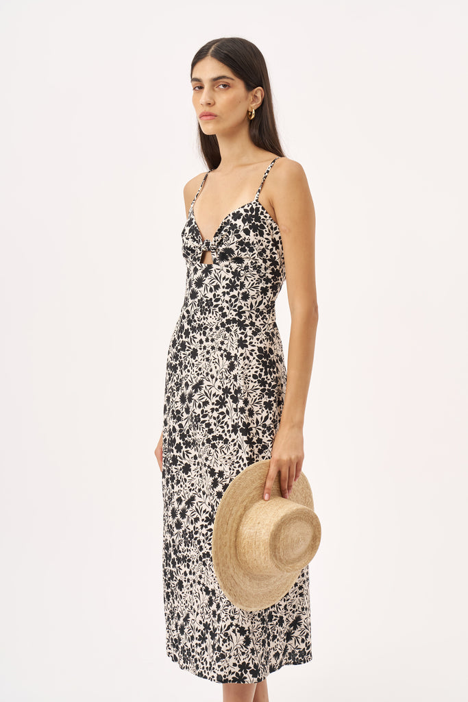שמלה באורך מידי עם אלמנט קשירה בחזה , הדפס פרחוני בגווני שחור וקרם