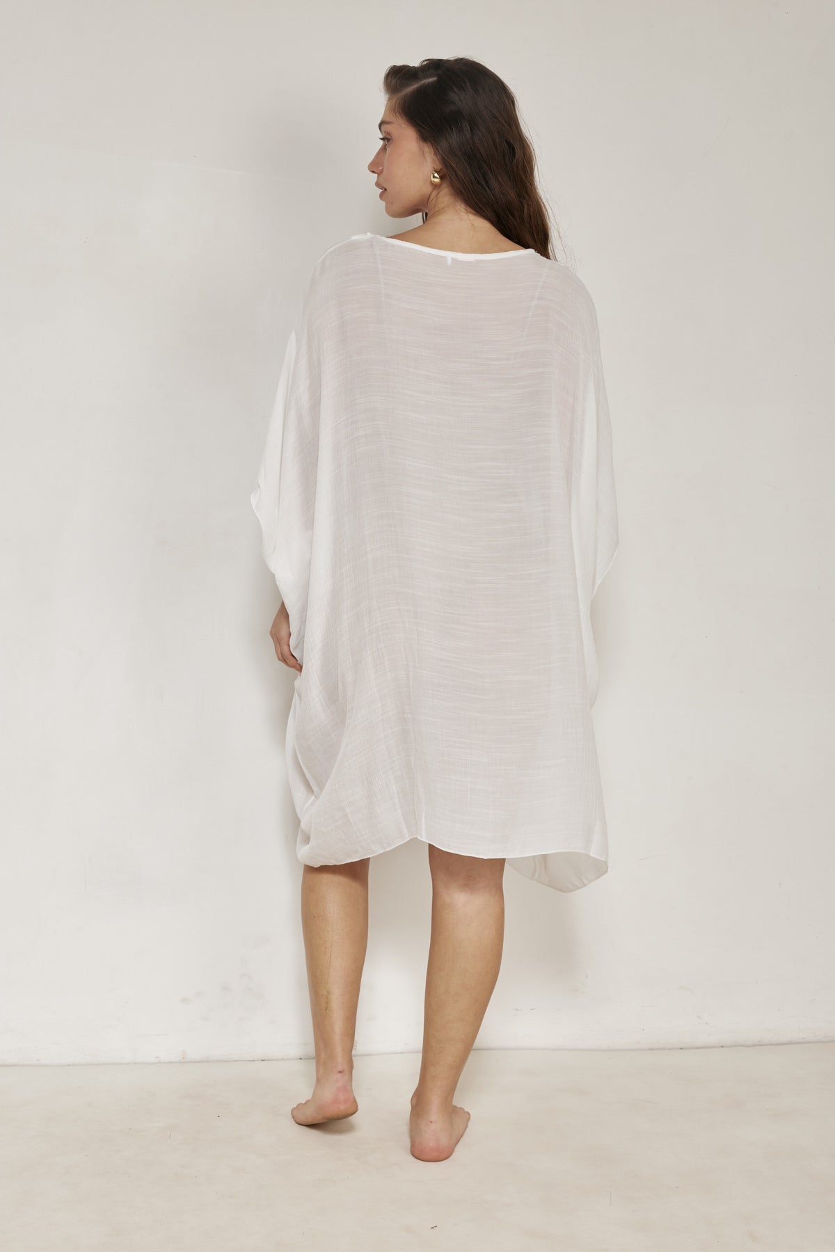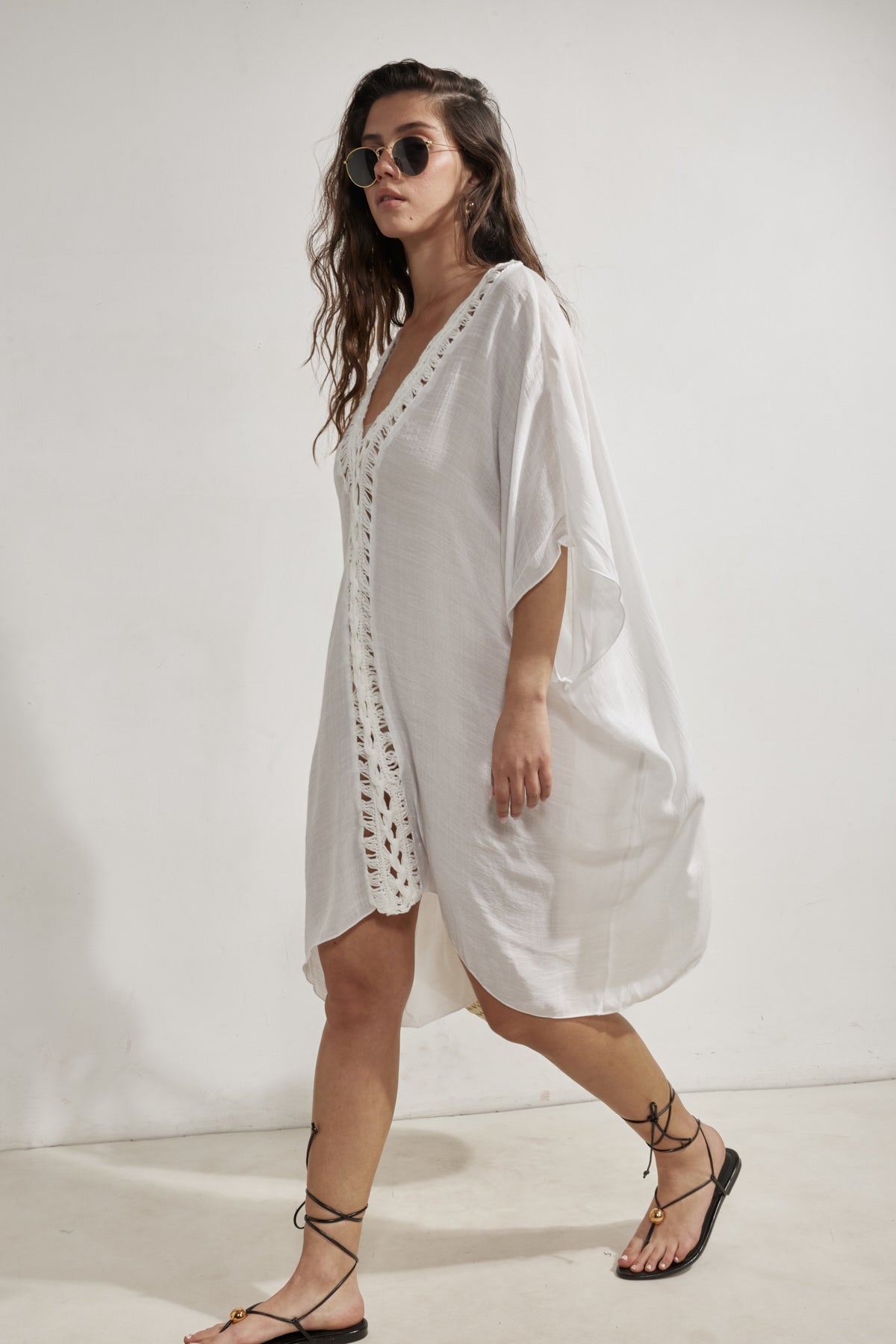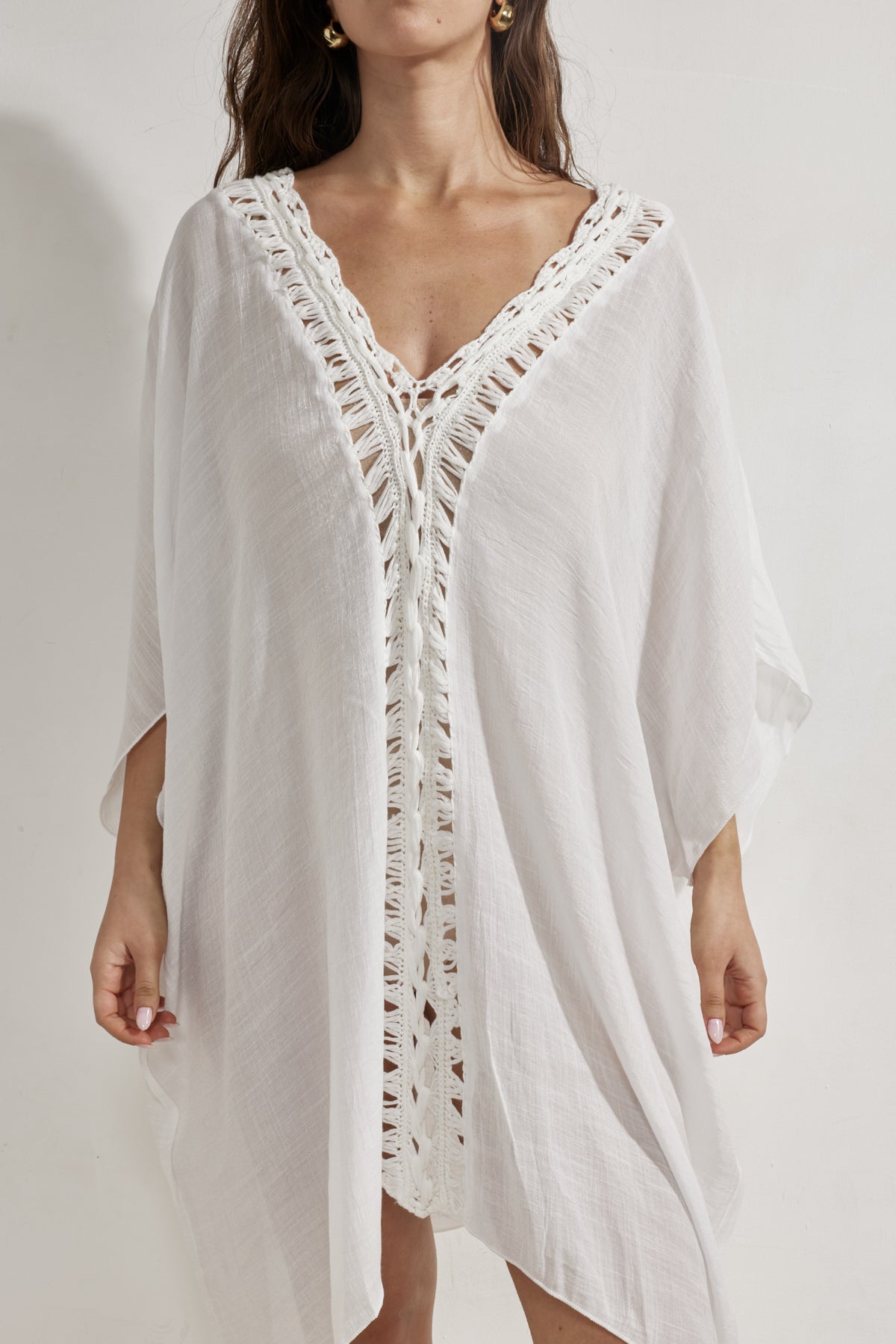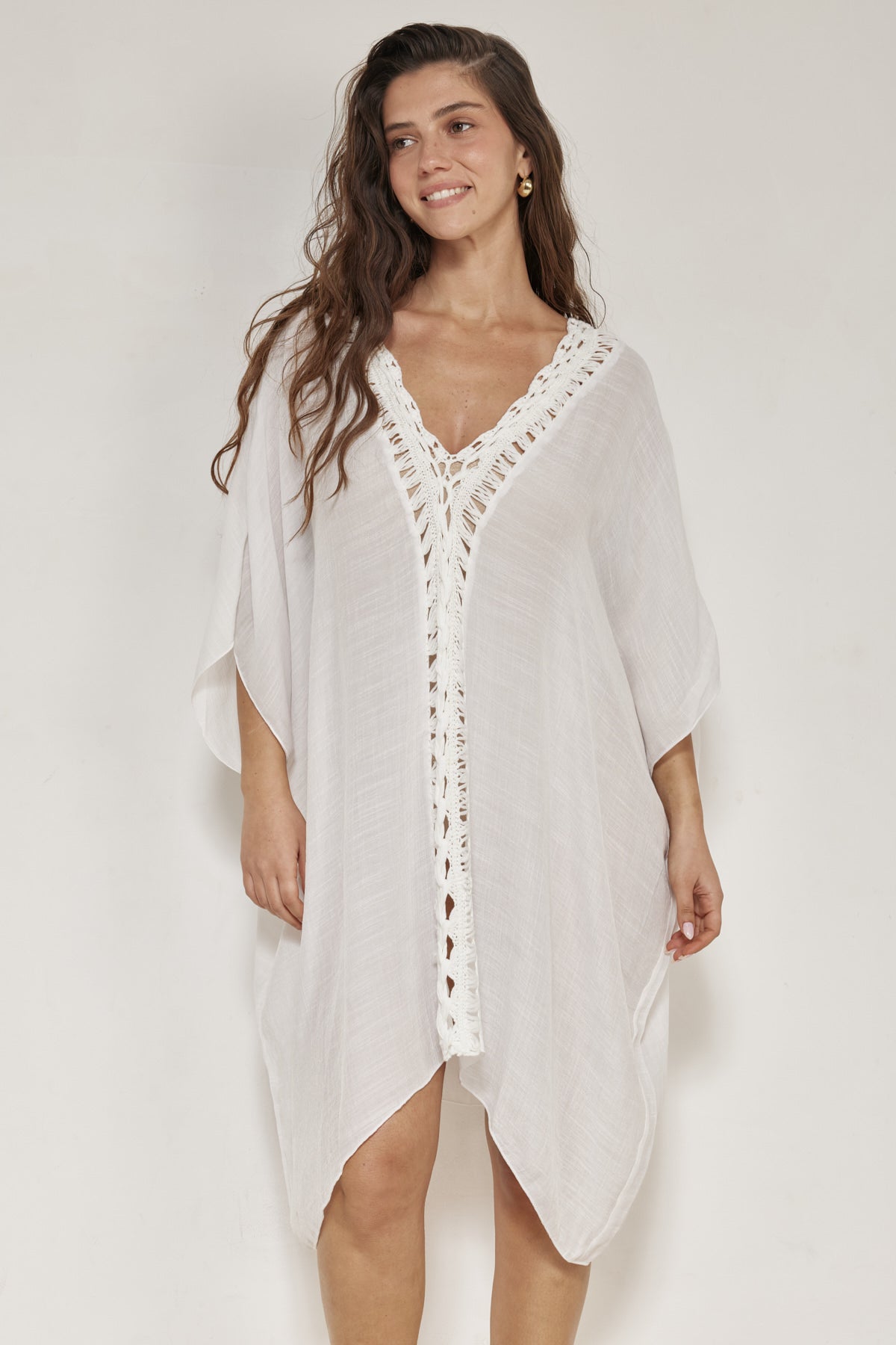טוניקה בצבע לבן עם שרוולים קצרים מתרחבים ועיטור קרושה סרוג מקדימה.