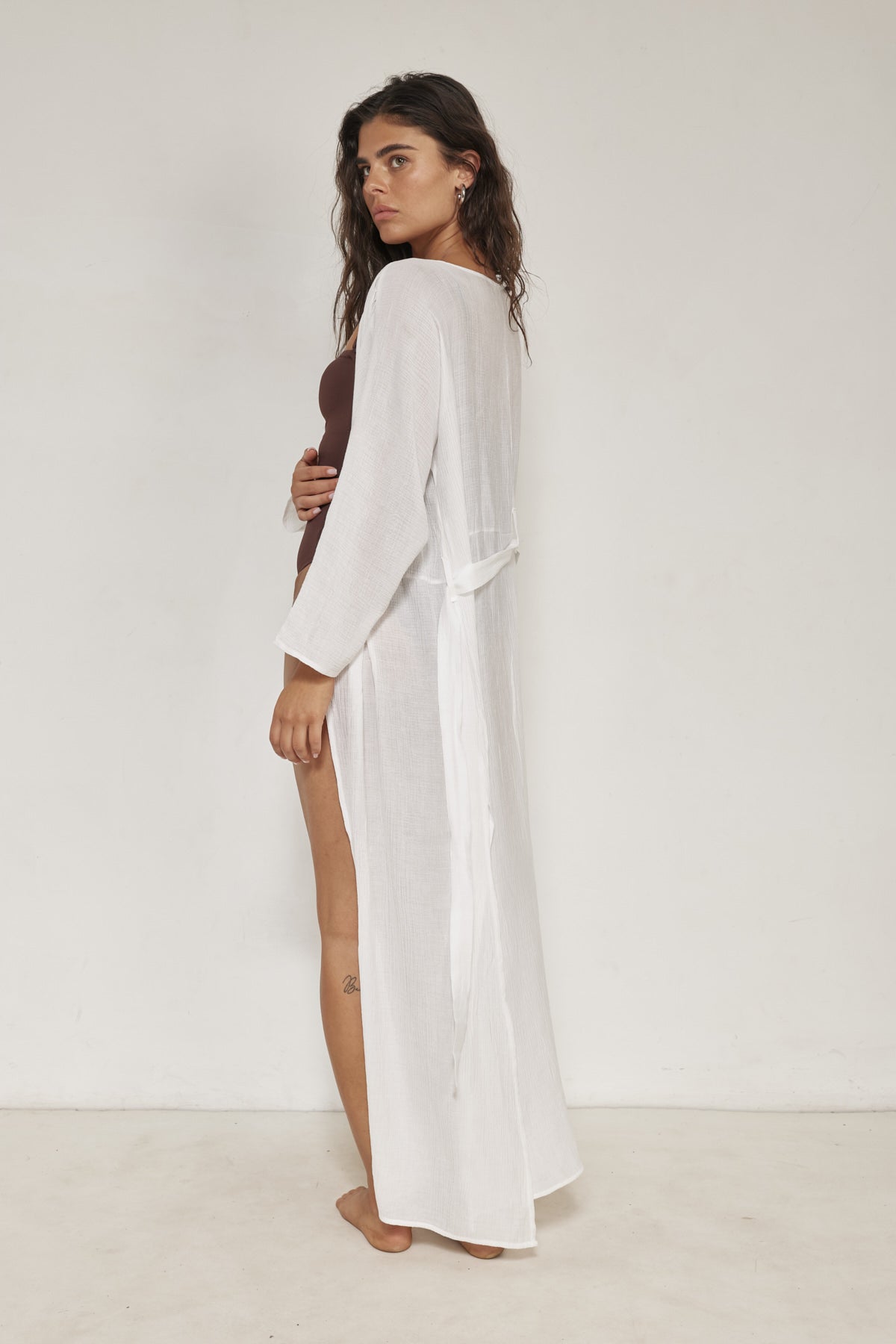 בגד חוף קימונו מקסי קלאסי בצבע לבן עם שרוולים ארוכים וקשירה במותן.
