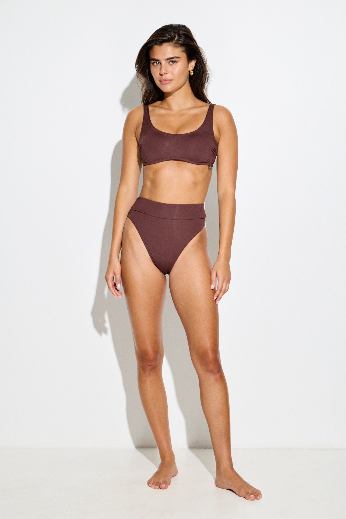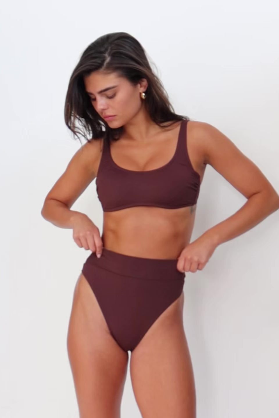 טופ ביקיני חום, ברזלים לתמיכה בחזה, כתפיות דקות מתכוננות, קשירה בגב וקאפים רכים נשלפים