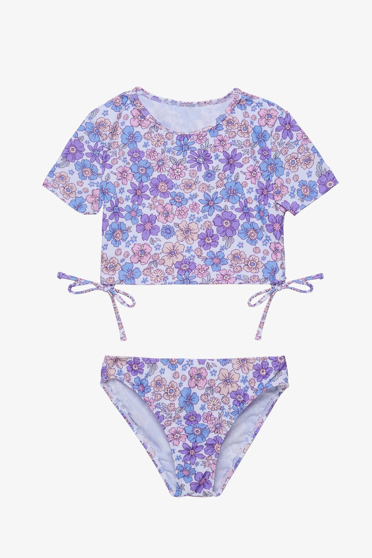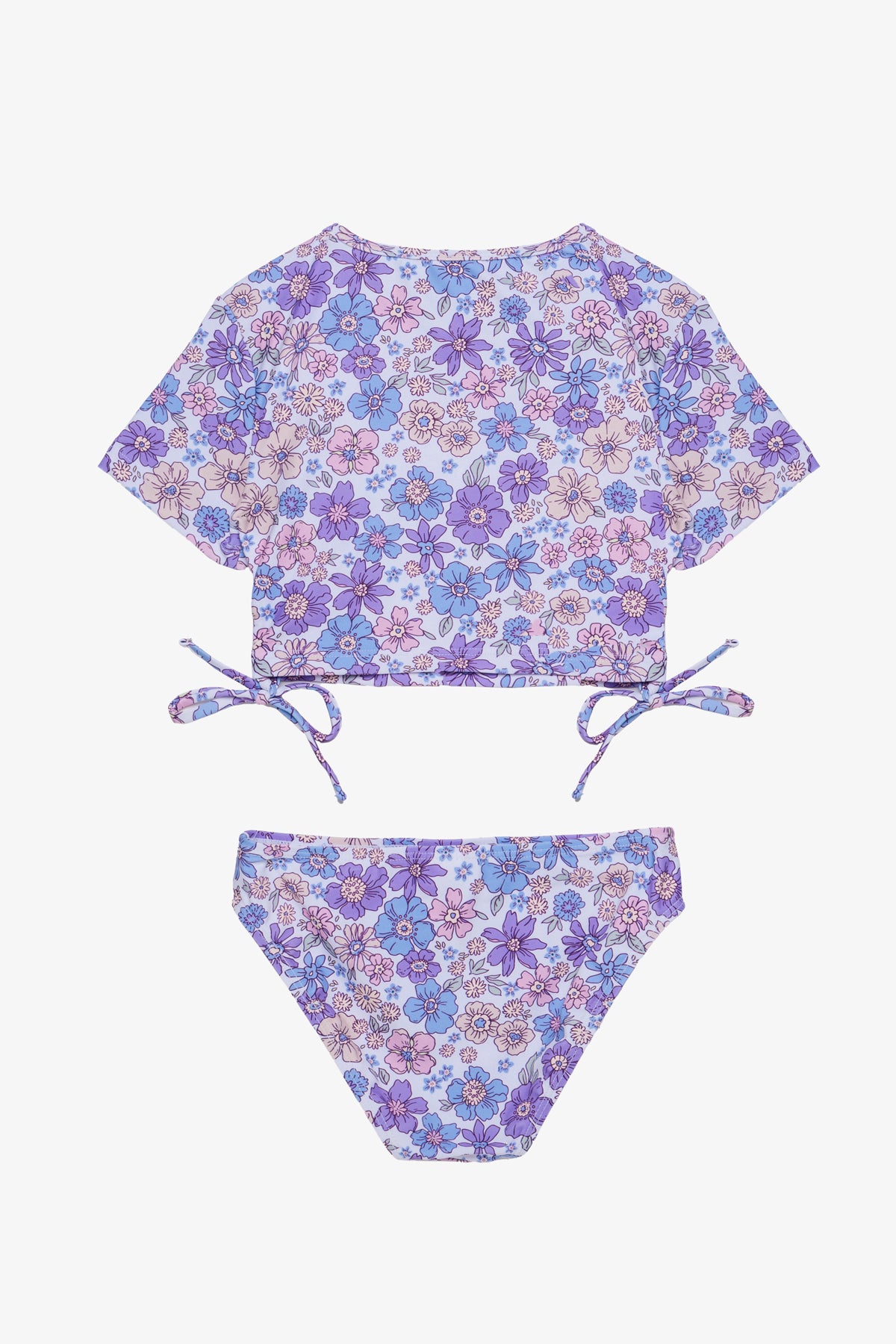 בגד ים לילדות סט ביקיני הכולל חולצת קרופ עם כיווצי קשירה ושרוולים קצרים תחתון ביקיני תואם בגזרה קלאסית.