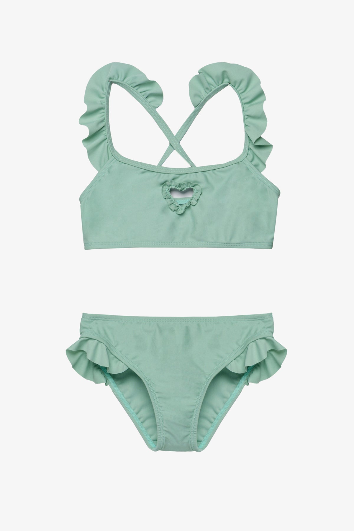 הסט כולל טופ עם כתפיות דקות וכיווצי מלמלה עם מפתח לב ותחתונים תואמים.