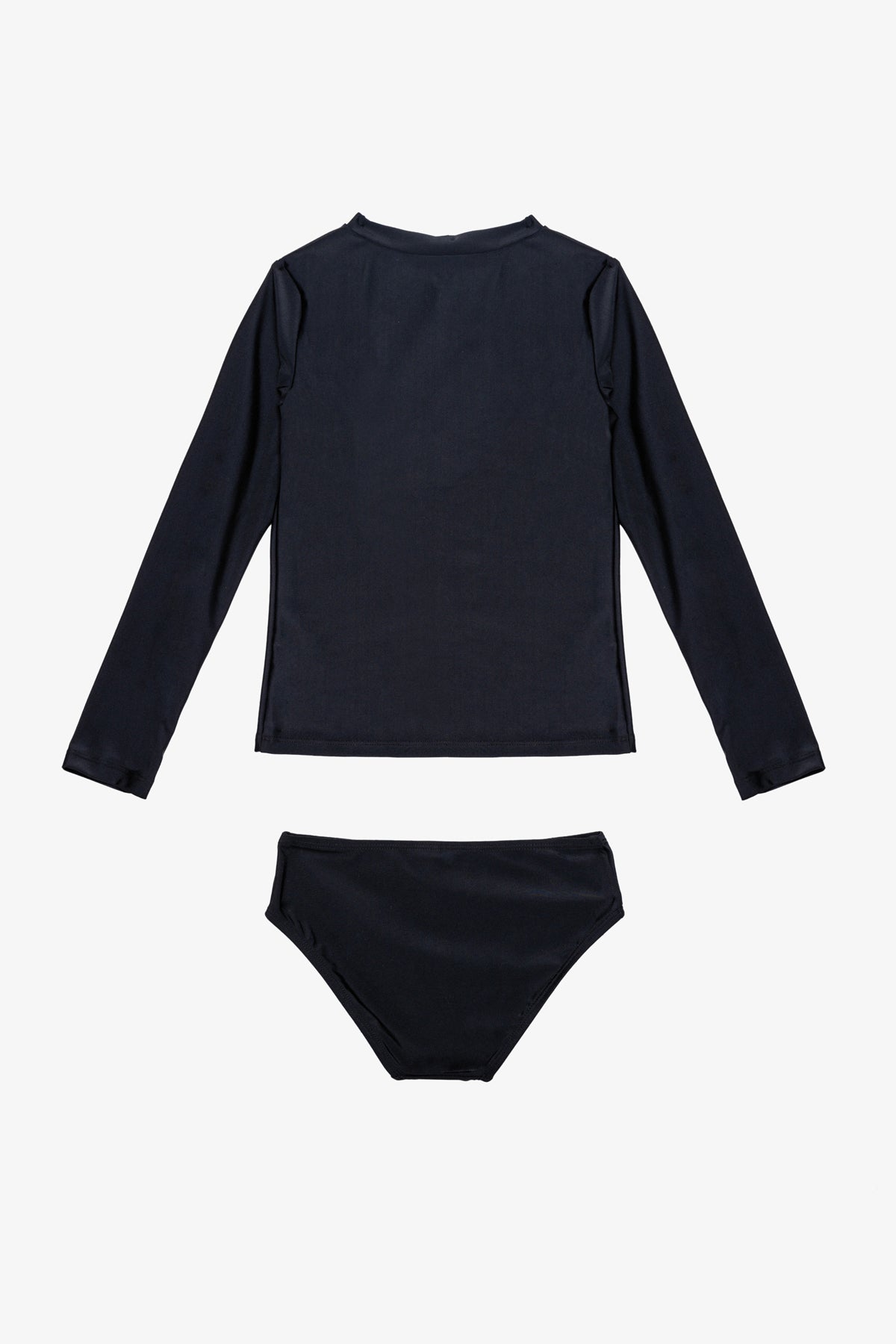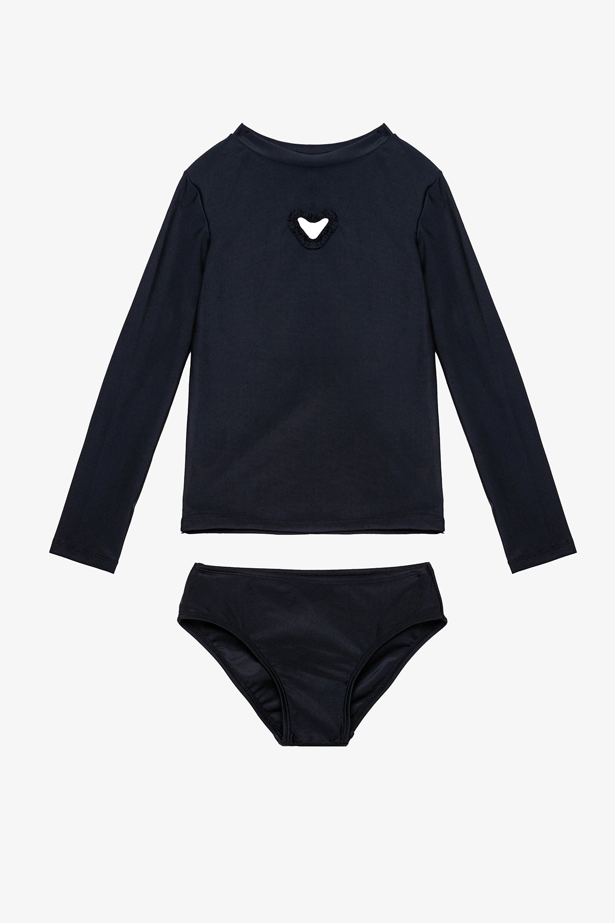 סט בגד ים שחור הכולל שני חלקים עם מפתח לב וכיווצי מלמלה.
