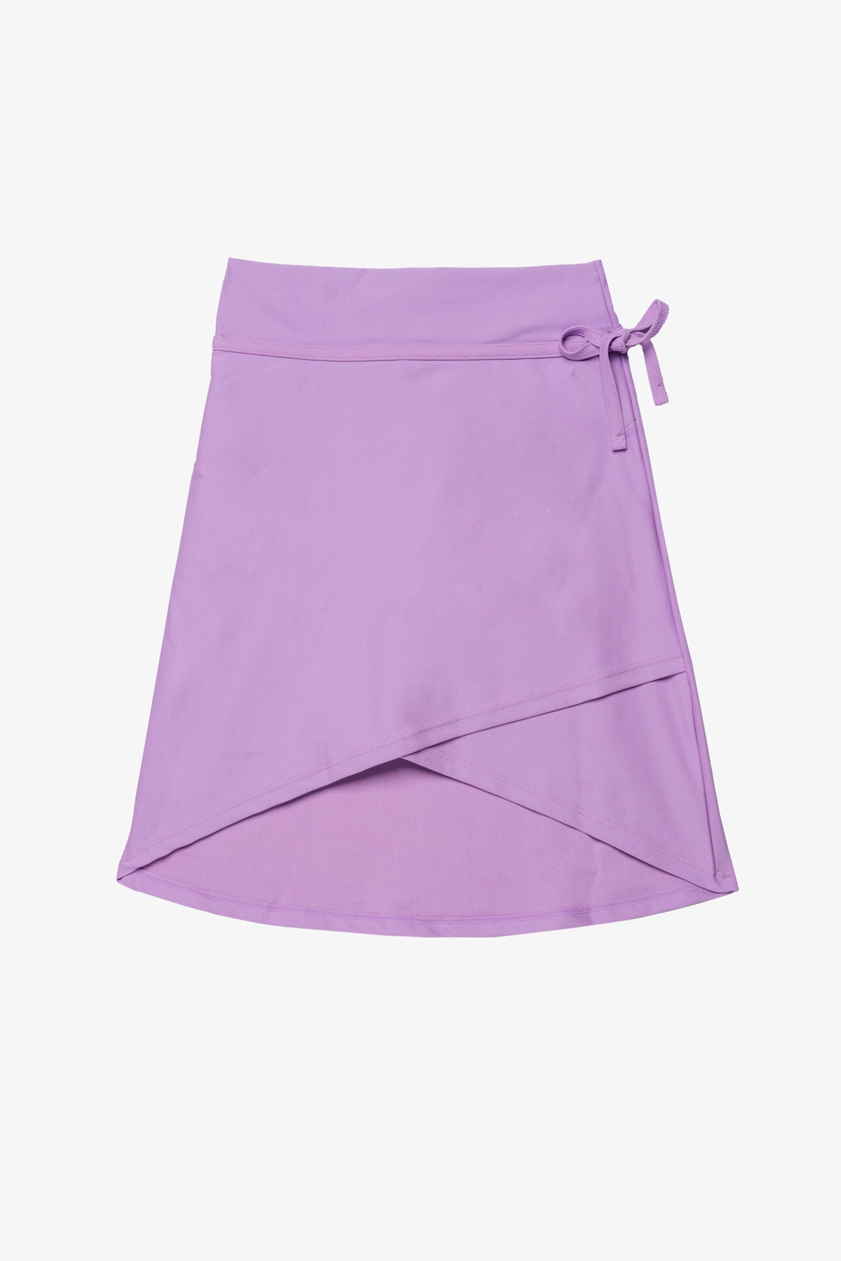 חצאית מעטפת קצרה מבד לייקרה בצבע סגול לילך עם קשירה ומכנסון פנימי
